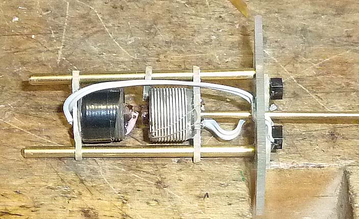 Hier sind die Filter eingebaut, die Antriebsmechanik fehlt noch. Man sieht die Schwingkreiskondensatoren und die SMD-Trimmer sowie die Messing-Stangen zur Bandbreiteneinstellung.