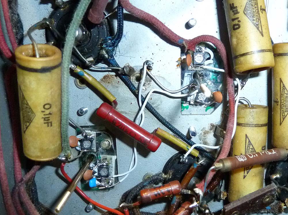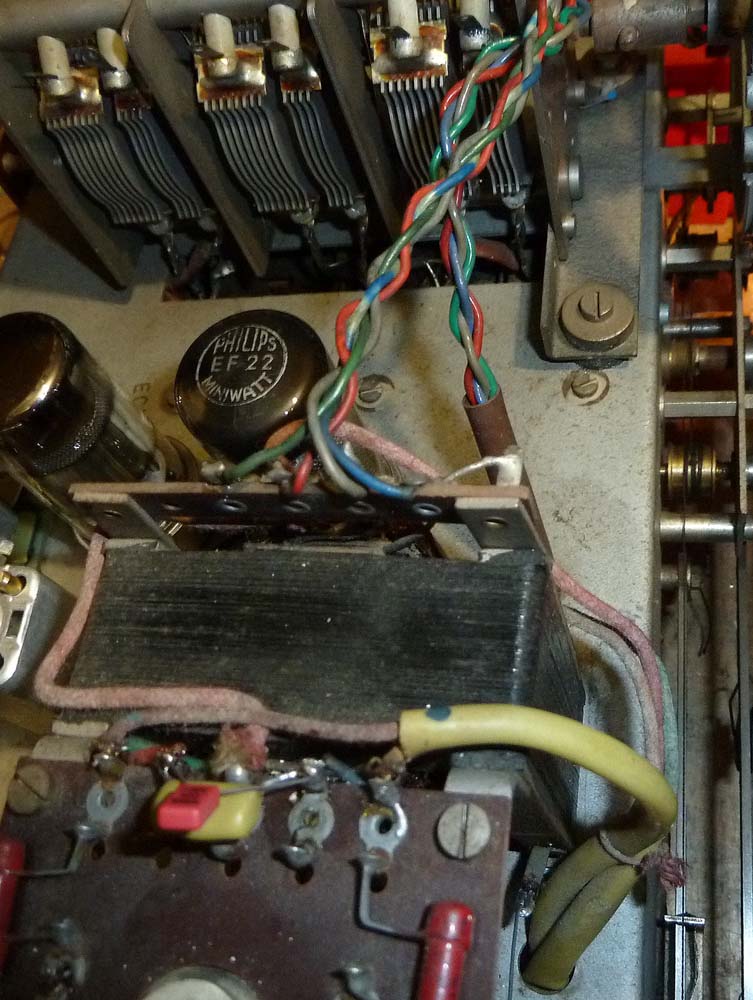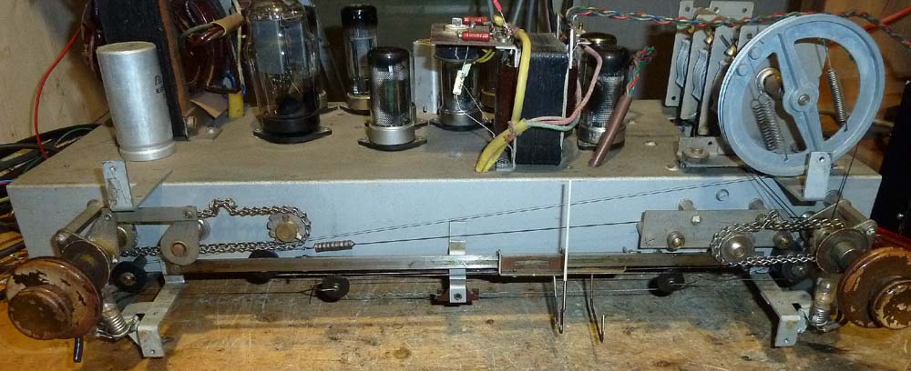 Man sieht hier auch die beiden Kettenantriebe, links für die Bandbreiten- und Hochtoneinstellung und rechts für den Wellenbereichsschalter. Eine ziemlich aufwendige Konstruktion, da beide Drehachsen dreiteilig sind (links Lautstärke, Höhen- und Tiefenschalter, rechts Abstimmung, KW-Lupe und Wellenschalter).