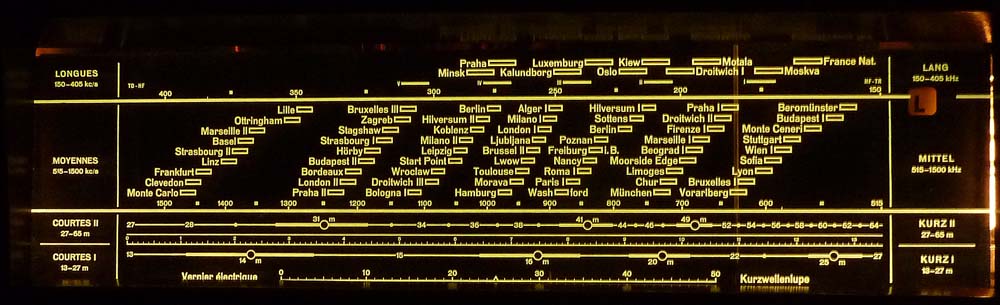 Skala im Dunkeln: Durch den seitlichen Lichteinfall leuchtet die Beschriftung, ähnlich wie bei den 'Biennophone'-Vorkriegsgeräten der Firma Velectra AG.