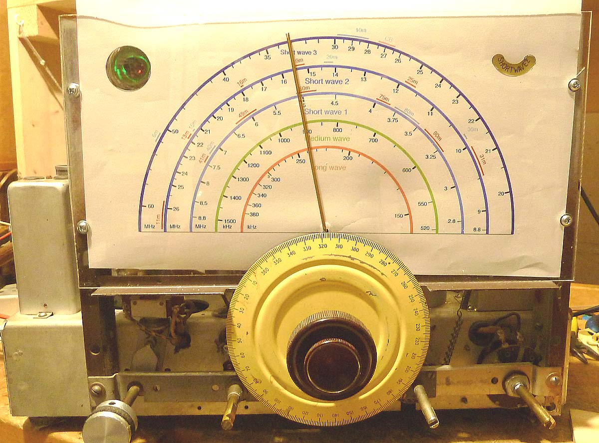 Ein paar Masse stimmen noch nicht ganz, das korrigiere ich noch, und für die definitive Version besorge ich noch stärkeres Papier, damit es sauber auf dem Acrylglas aufliegt. Die Skalenbeleuchtung muss ich auch noch etwas modifizieren, die 220V-Lampen gibt es nicht mehr, abgesehen davon ist mir hier die Netzspannung etwas nahe am Chassis. Möglich wäre eine LED-Zeile oder auch ein paar 6V-Glühbirnen, wenn das den Trafo nicht zu stark belastet. Da er aber auch nach einer Stunde Betrieb trotz 230V-Netzspannung nur handwarm ist, dürfte er noch etwas Reserve haben.