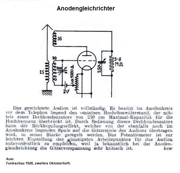 Ich habe mal das Wichtigste herausgeschält: Da steht: "Das gezeichnete Audion ist vollständig ---- vor dem Telephon liegender Hochohmwiderstand" .... welcher mit 3-8 MOhm angegeben wird! Ist doch klar, dass dann nichts zu hören ist!
