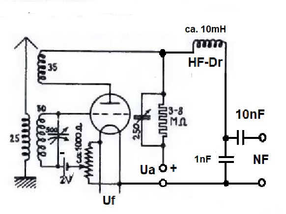 Ich habe noch etwas gemessen. Eine Verkleinerung des Anodenwiderstands vom Audion bringt ein etwas früherer Rückkopplungseinsatz, aber keinen spürbaren Lautstärkegewinn. Die NF-Verzerrungen hängen praktisch nur vom Modulationsgrad ab und nicht vom HF-Pegel. Die Empfindlichkeit für ein gut hörbares Signal liegt bei etwa 50uV (bei entsprechend angezogener Rückkopplung), so ist auch das Eigenrauschen hörbar. Im Gegensatz zum Gitter-Audion gibt es hier keinen Schwelleneffekt, da hier ja kein Kennlinien-Knick zur Demodulation ausgenutzt wird, sondern der quadratische Verlauf der Kennlinie, und der ist stetig.