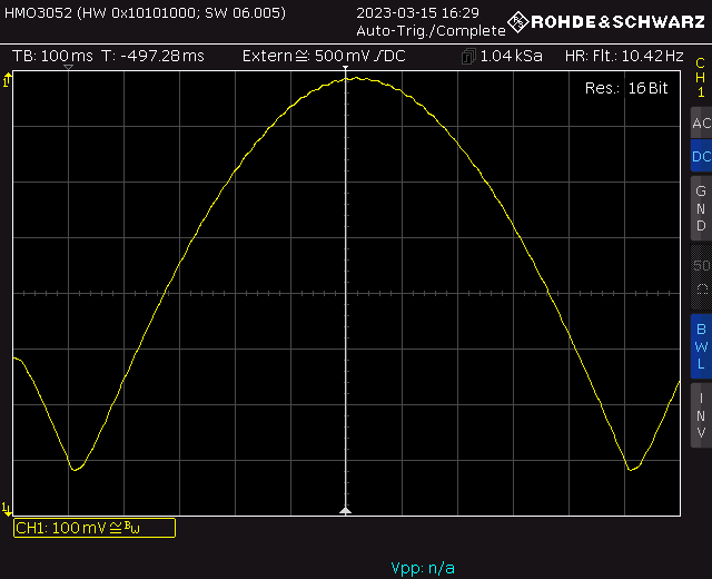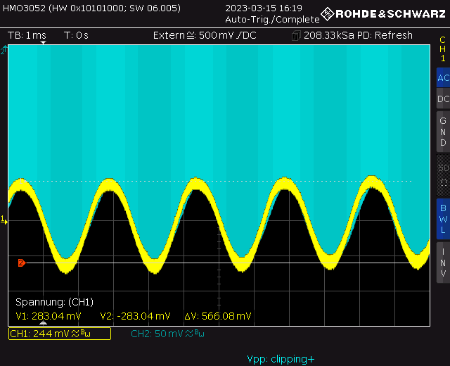 Betrieb als Synchrondemodulator: Die erste Oberwelle ist 40dB gedämpft (also 1% Klirr) und die zweite ist nicht mehr sichtbar. Die 'Seitenbänder' sind Netzbrumm von der Brummschleife aus Signalgenerator und Oszi.