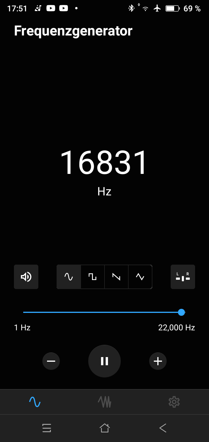 Oben das 17 kHz Signal auf der Sekundärseite des Übertragers. Unten was an der Primärwicklung anliegt. Der Sinus stammt von der Android-App "Frequenzgenerator". Die App funktioniert auch zusammen mit Bluetooth. Empfindlichkeit der beiden Eingänge des Oszis: 50 mV/Div. Die beiden Wicklungen des Übertragers haben jeweils einen Gleichstromwiderstand von 200 Ohm. Ich nehme an es ist ein 600 Ohm Übertrager.