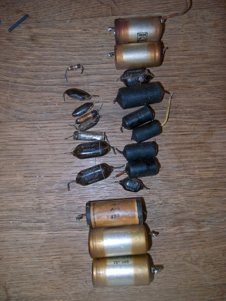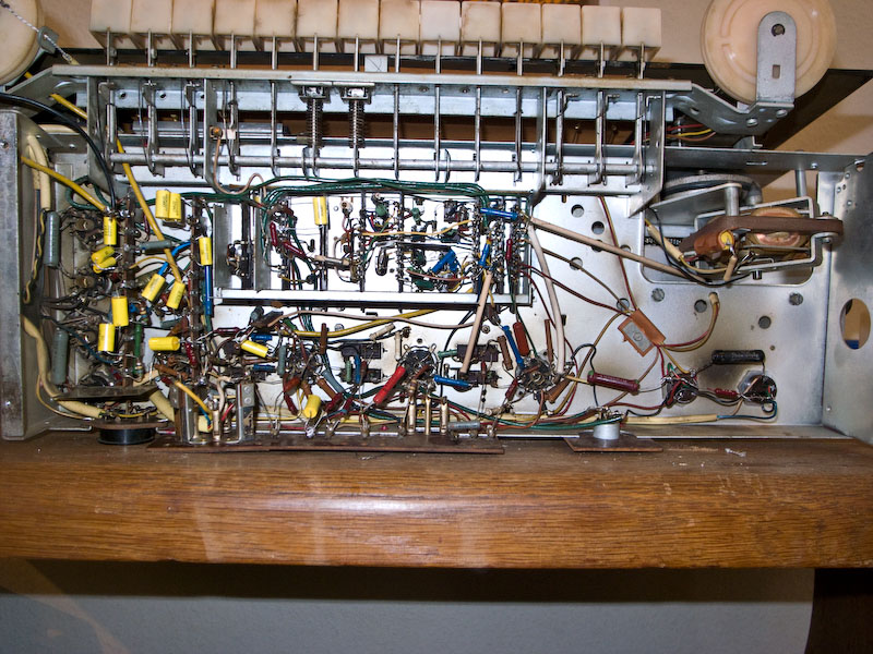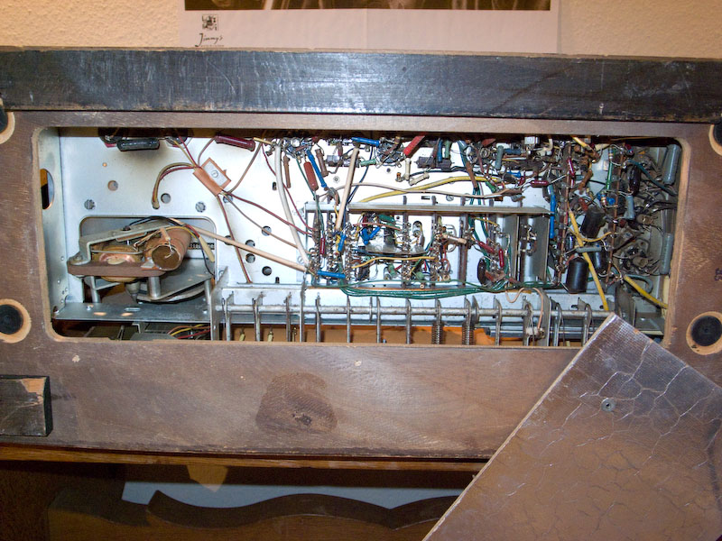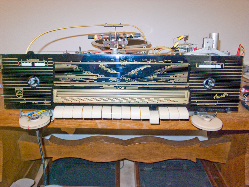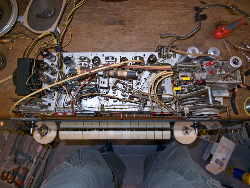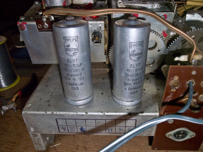 Habe jetzt die Skalenscheibe drangefummelt. Das geht nicht wirklich gut. Auch die Pappe dahinter ist extrem sensibel und reißt sehr leicht, wenn man sie in die Haltefeder einhängt. Von unten sah das Radio vorher so aus: diese Burschen mußten das Radio nach 54 Jahren verlassen nun sieht es so aus: die beiden Becherelkos mußten auch entkernt werden. Es war deutliches Brummen zu hören und der eine sabberte schon durch die Belüftung.