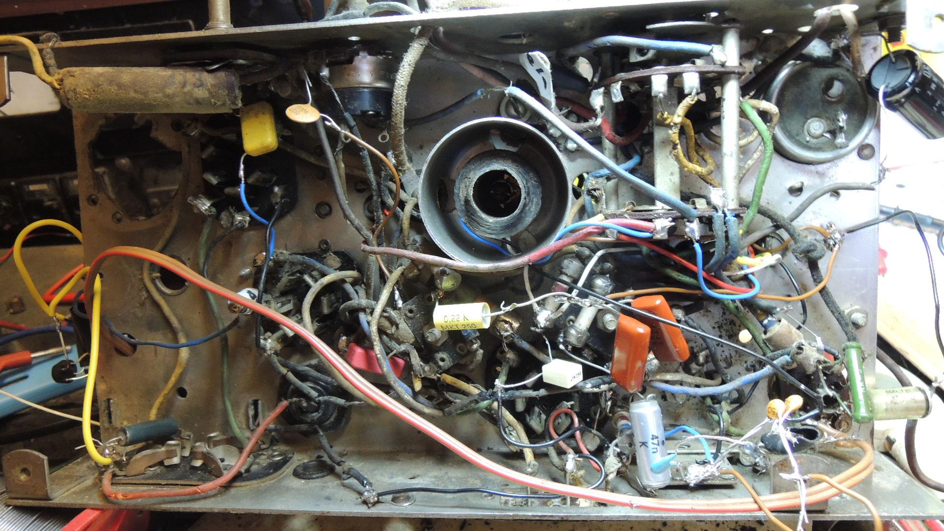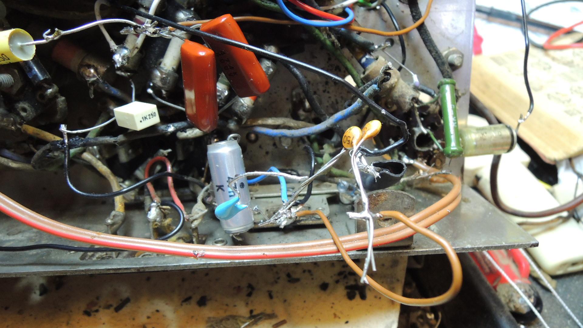 am Samstag sass ich natürlich wieder am Atwater. Heute werde ich Euch weiter berichten. Ich habe zunächst mal viel Arbeit darauf verwendet, dass die Frequenzen der drei Wellenbereiche wieder mit der Skala überein stimmen. Das ist mir gut gelungen. Die einzelnen Verkürzungskondensatoren des Oszillator befinden sich unten am Chassis rechts. Wie Ihr schon erkennen könnt, habe ich etwas mit den Kapazitäten probiert. Aber nachdem ich ein schärferes Schaltbild habe, konnte ich sehen, dass die Werte fast mit den von mir ermittelten Werten überein stimmen. Den Rest bringt der Nachabgleich. Die Oszillator-Bandfilter sind in dem Gerät getrennt montiert. Ich habe hierzu die Schwingkreise von den alten Drähten (alle porös) abgeknipst und neue, farblich passende, eingezogen. Ich hatte erst Angst. Aber alles funktioniert weiterhin. Seht Euch mal die Sammlung von alten Kondensatoren an. Leider kann man die Hülsen nicht mehr verwenden, weil es sich nur um Papier handelt, welches um die Wickel drum geklebt ist. Auch actet bitte mal auf die Anschlußführung. Ich habe mir mal vor längerer Zeit solches Plastik-Bastelrohr gekauft. Das kommt mit dem Durchmesser der meisten original-Kondensatoren hin. Auf den kondensatoren steht nur die Ersatzteilnummer z. B. 622 o. Ä. Das will ich auch wieder so machen. Eine Schaltplankopie lege ich ins Gerät für spätere Arbeiten. Ich habe rotes und grünes Geschnekpapier. Das werde ich auf DIN-A4 zurecht schneiden und dann ab in den Drucker. So sind die Kondensatoren dann auch da. Ich habe bei der Gleichrichterröhre etwas gemogelt. Dort ehört eine 80 (nur 80!) rein. Die ist nur noch sehr teuer zu bekommen. Ich habe mich für die 5 U4 entschieden. Die Röhre ist gut zu bekommen und hat etwas bessere eigenschaften als die 80. Den Röhrensockel habe ich auch bekommen. Nun hat diese Röhre halt eine Führungsnase. Nicht ganz konform, aber geht. Ärgerlich: Ich weiß nicht, wer da so ein großes Loch in das Chassis gemacht hat und wieso. Hoffentlich ist noch genügend Blech für meine Röhrenfassung darum. Noch eine Sache: Der Drehko hat eine Zahnscheibe. Die wird durch eine simple Gummirolle getrieben. Die ist vertrocknet und porös. Die nimmt nicht mehr mit. Was man hier macht, muß ich sehen. Wenn heute oder morgen die Gleichrichterröhre kommt, baue ich sie ein, ebenso, wenn die Kondensatoren fertig sind. Bei größeren Lautstärken kreischt das Radio mächtig. Dies liegt daran, dass ich sämtliche z. Zeit überflüssigen Kondensatoren ausgelötet habe. Ich habe mich erstmal um das wesentliche gekümmert. Daher gibt es momentan nirgends eine Entkopplung. Für die Fehlersuche war das angebracht. Die originale Mischröhre habe ich ganz günstig in e... Amerika gekauft. Die ist unterwegs und kommt auch irgendwann. Ich berichte weiter.
