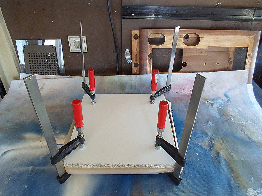 Und am Schluss die Furnier richtig auftragen so, dass die platzt nicht und keine Blasen kommen. Es gibt mehrere Methoden da für, aber ich klebe mit heißem Eisenbügel.