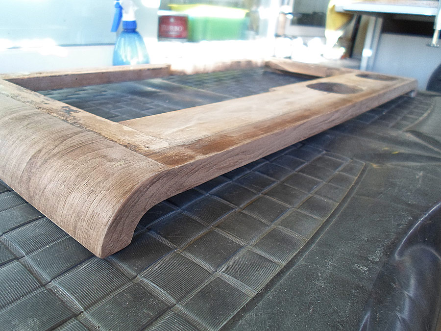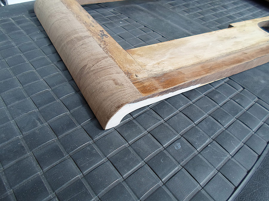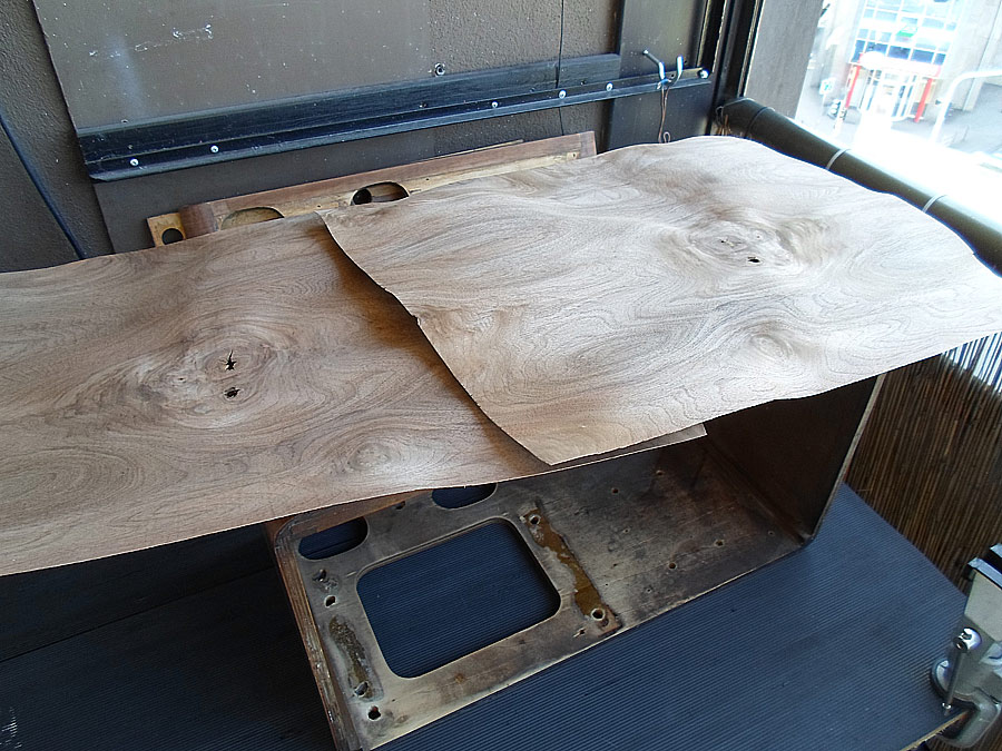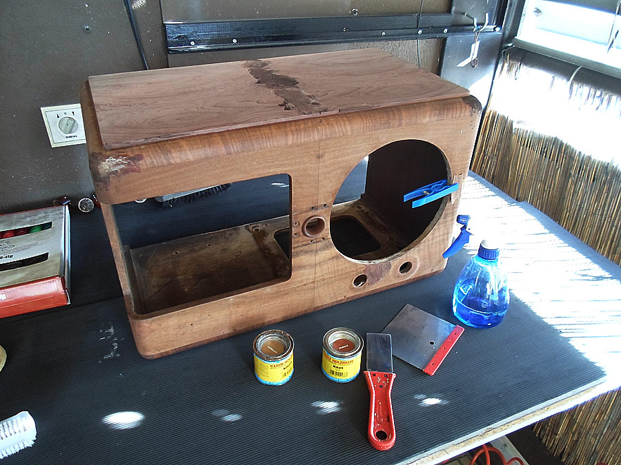 jetzt bin ich noch ein Schnittchen weiter gekommen. Die beschädigte Teile sind neu furniert. Aber noch nichts bearbeitet, nur draufgeklebt und abgeschnitten. Wer hat schon mit Wurzelholz gearbeitet, der weist wie problematisch ist solche Furnier aufzutragen. Vorher man muss die Blätter flach machen. Dann kann man die richtig zuschneiden, so das die Nut später kaum zu sehen ist.