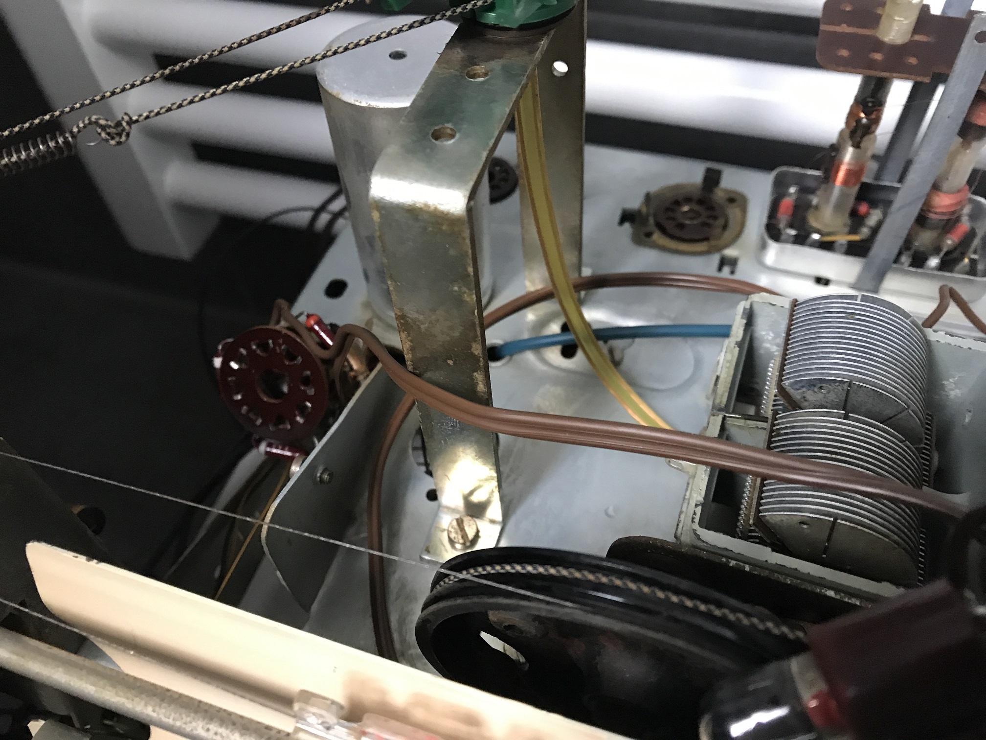 Also normalerweise hänge ich die Röhren kopfüber in Spülmittelwasser (nur die Röhren ohne Außenbeschichtung! also Noval, Rimlock, Oktal...) sodass der Sockel nicht nass wird. Der Schmutz lässt sich dann ganz leicht abwischen, man muss nur bei der Beschriftung aufpassen. So wie auf dem Bild gezeigt mache ich das nicht mehr, in dem Fall wäre es kein großer Verlust weil die Röhren mit hoher Wahrscheinlichkeit sowieso verbraucht sind. (Verfärbungen am Glas, das Gerät ist sehr viel gelaufen. Siehe auch die verspiegelten Glühlampen)