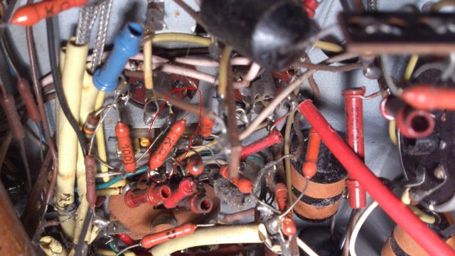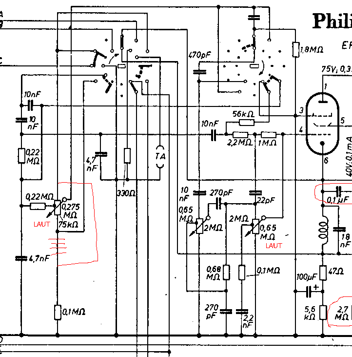 Das Gerät war noch etwas leise. Nachdem ich die Spannungen der NF nochmals kontrolliert habe war die g2-spannung der EF40 mit 20V etwa halb so groß wie angegeben. Zuerst hatte ich den Teerkondensator in Verdacht (siehe rote Markierung) . Probeweises tauschen hat allerdings keine Besserung gebracht. Somit wurde mein Verdacht auf den Vorwiderstand 2,7 MOhm (rote Markirung) gelenkt. Eine Messung bestätigte das dann auch schnell. Der Wert war nun über 7 MOhm. Zu allem Überfluss steckte der Widerling natürlich schön versteckt in einem Schlauch.