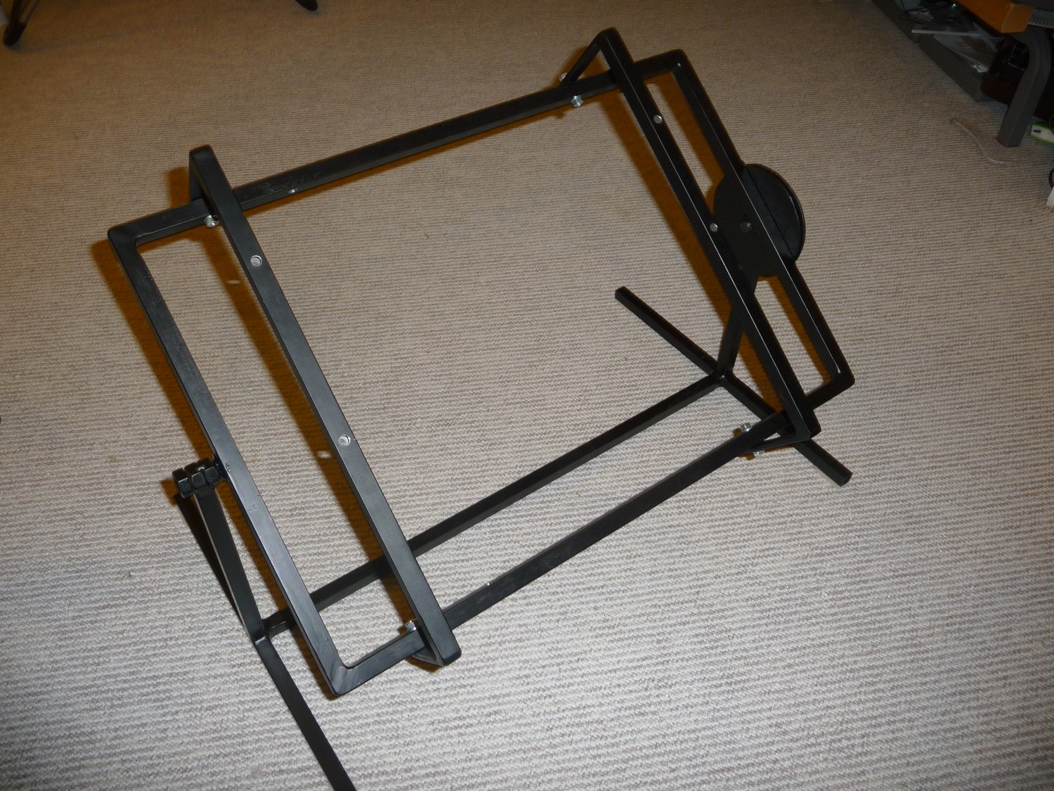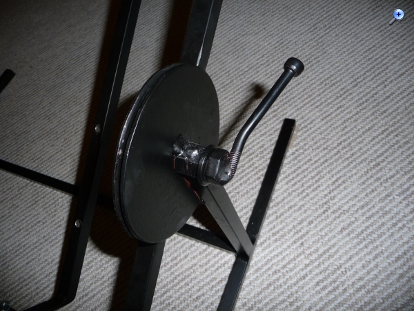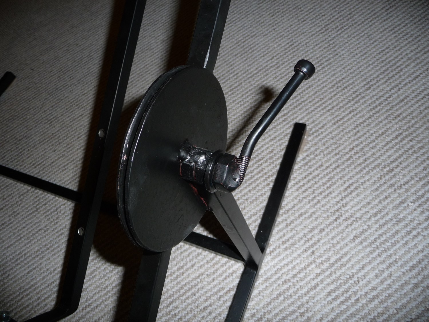 Wichtig war mir, das der Schwenkrahmen in jeder Stellung fixiert werden kann, deshalb habe ich eine Bremse bestehend aus zwei Metallscheiben mit zwischengelegter Gummischeibe vorgesehen. Durch festziehen der Knebelschraube wird die Bremse angezogen.