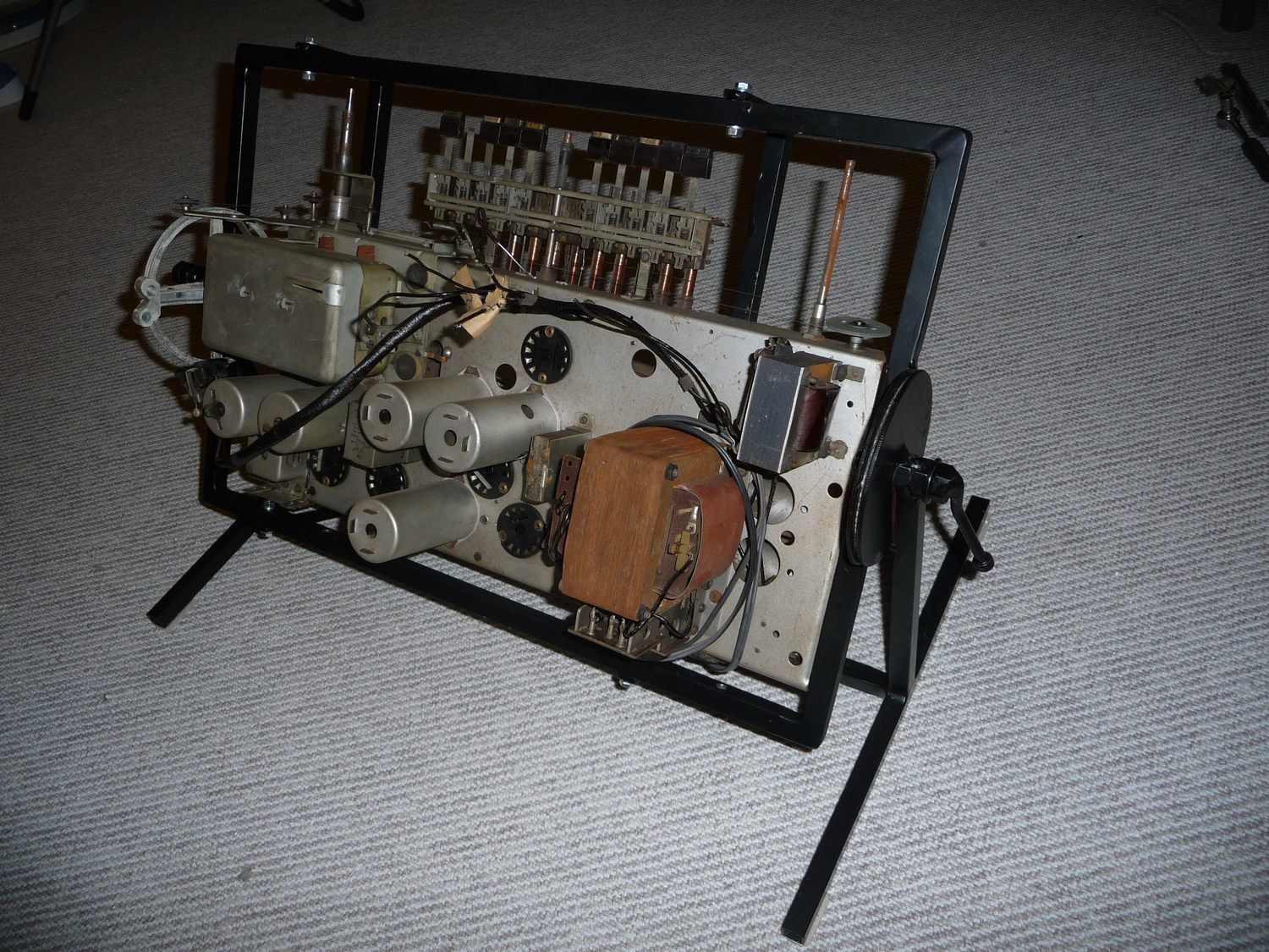 Im Kaufpreis enthalten war auch noch ein NF-seitig recht verbasteltes Chassis mit fehlendem Netz- und Ausgangstransformator. Aber die beiden Trafos habe ich ja auf meinem Chassis. Viel wichtiger ist jedoch, das die Skalenseilführung komplett ist und beide großen Seilscheiben dabei sind. Auch alle Tasten und Drehknöpfe waren dabei.