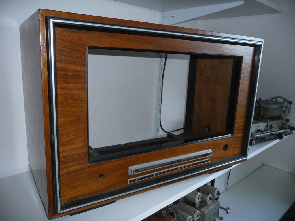 Somit konnte ich für einen humanen Betrag ein Schlachtgehäuse -in einem für mich absolut wohnzimmertauglichen Zustand- erwerben. Mit dabei waren auch die Schallwand und (leider) nur die beiden oberen Skalenstreifen.
