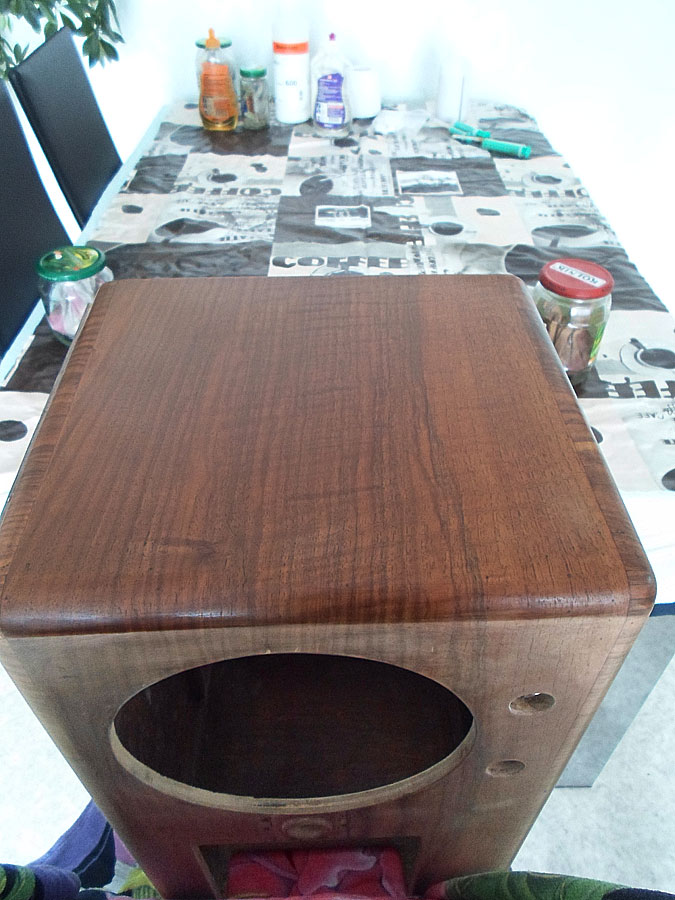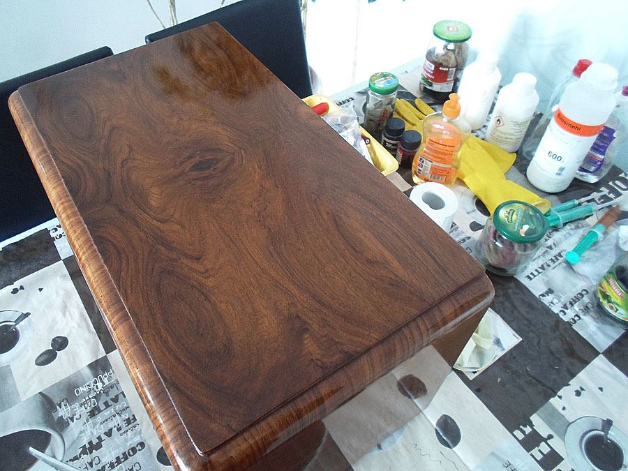 Und dann kamen die ersten Schichten vom Lack. Französische Politur nimmt viel Zeit, aber das Ergebnis ist dann das beste. Kein heutiger moderner Lack kann die Struktur von dem Holz zeigen wie Schellack. Er bildet immer die warme und tiefe Farbe, was keiner anderer machen kann.