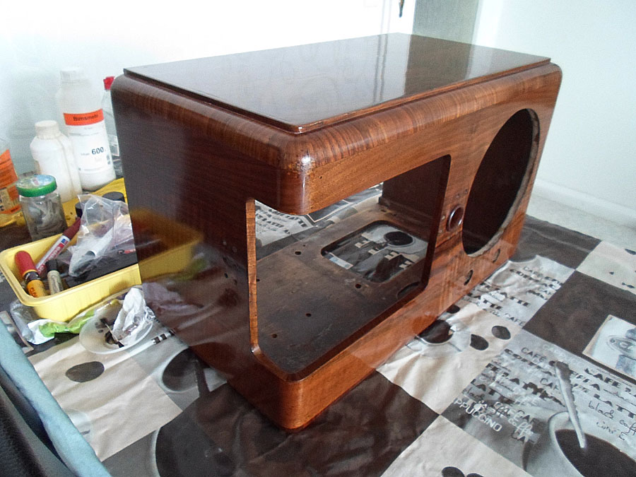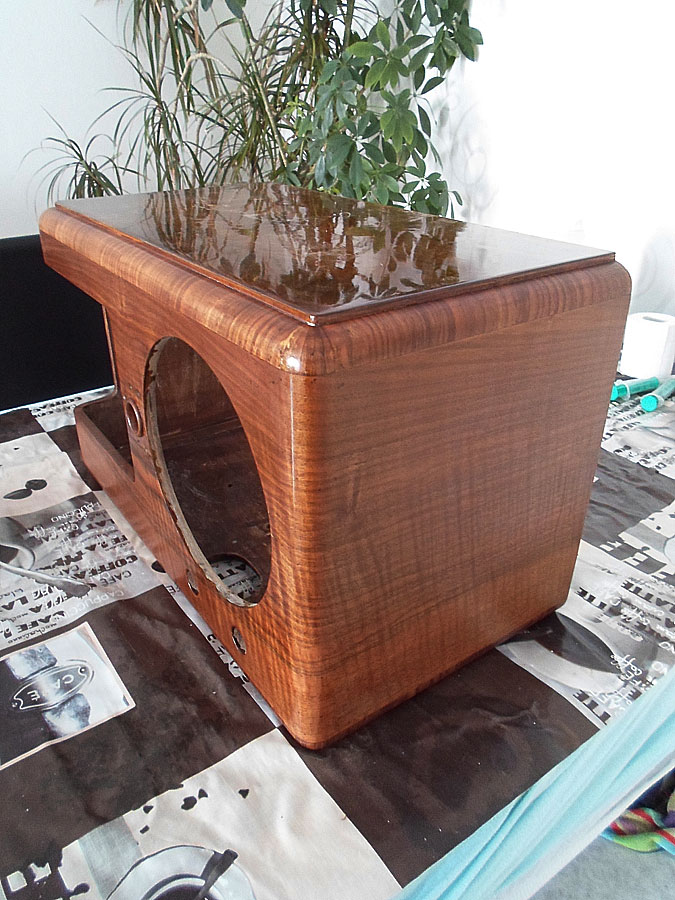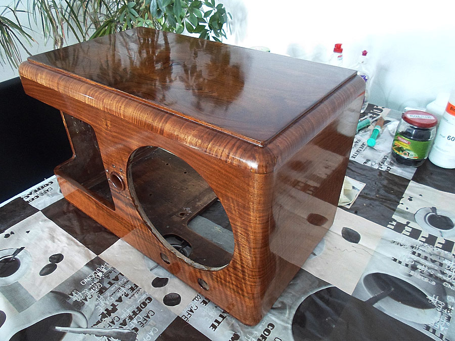 Wie ich habe schon oben geschrieben, nach erstem Lackieren, neben den gebildeten Flecken, hat mir auch die zu glänzenden Oberfläche nicht gefallen. Die war einfach nicht passend zu dem Radio, einem Gerät der 30er Jahre. Schuld war der Lack, ein HS 2K. Deswegen habe ich den Lack komplett runter gezogen und alles mit Französische Politur angefangen. Das ist eine Technologie und der Lack aus den damaligen Zeiten. Ich bin 100% sicher, dass so ein Gerät wie das Radio, damals hat nicht schlechter ausgesehen, als ich das jetzt mache.