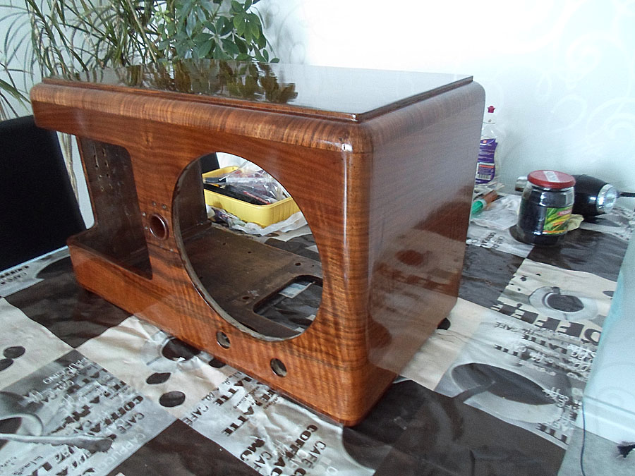 Gestern und heute sind noch ein paar Schichten Lack drauf gekommen. Jetzt muss man dem Gehäuse ein paar Tage Ruhe geben. Der Lack soll sich ein bisschen setzen. Und dann kommt die zweite Runde mit Politur.