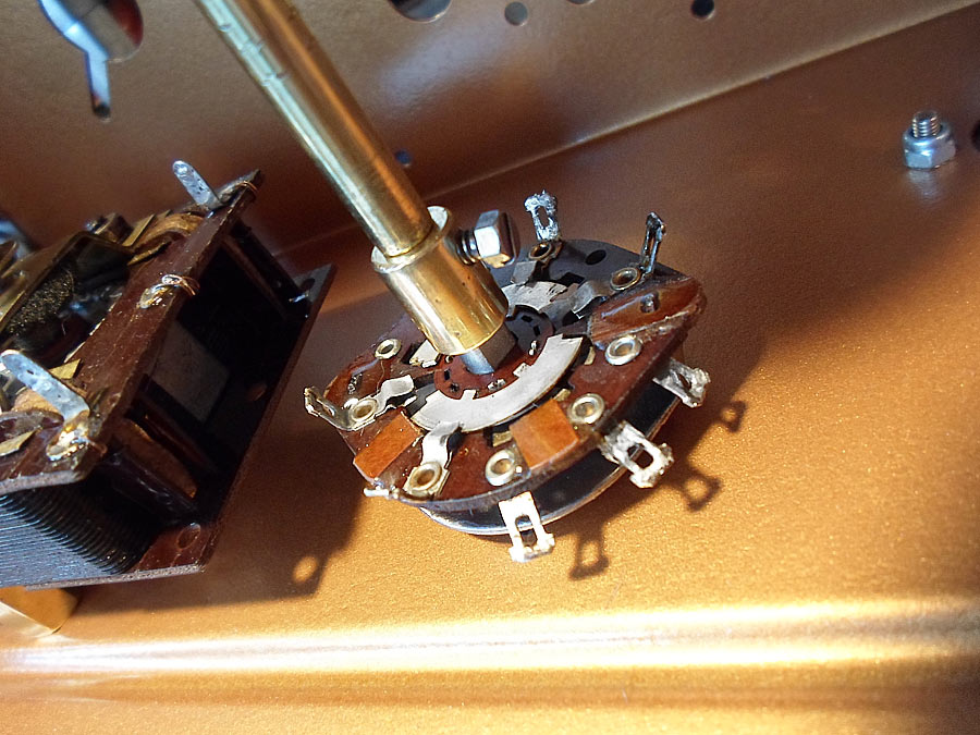 Dan kam auf mein Tisch der Lautregler. Das Poti war von Anfang an schon Schrott. Restauration hat hier kein Sinn gehabt. Ich habe ein anderes passendes gefunden& das war ein 3 x fach, und umgebaut. Problem war hier das die Achse bei dem Poti soll 75mm lang sein. Ich habe die Achse einfach nachgerüstet. Die Gewinde habe ich mit Flüssigem Metall fixiert.