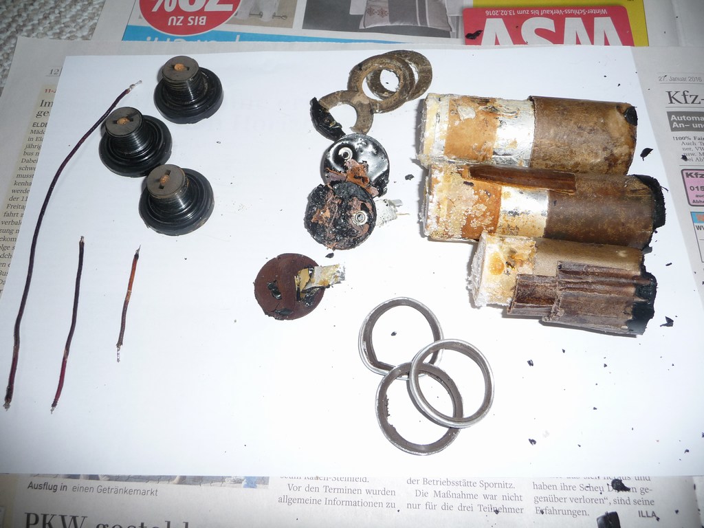 Angefangen hatte ich mit den Siebelkos, hier mache ich keinerlei Experimente mit Formatieren o.ä., die bestücke ich immer neu. Entkernt mit der gewohnt vorsichtigen Methode (Alubecher auffeilen, Schraube ins Innere würgen, Becher erwärmen und mit der Zange den Inhalt herauszerren). ;) Hier die Ausbeute: