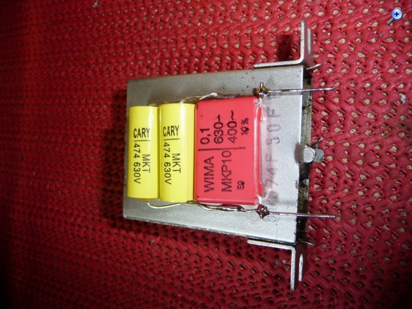 Auch der doppelte Blockkondensator wurde neu bestückt. Es ist übrigens ein Heidenspass, die bis zu 25 cm langen Anschlussdrähte wieder an Ort und Stelle zu bringen. Scheinbar wurden die Blockkondensatoren im Werk als erstes montiert und ihre Drähte liegen unter allen anderen Kabeln und Bauteilen: