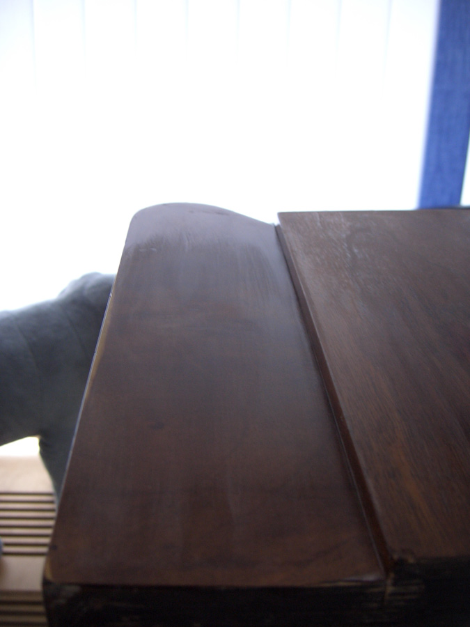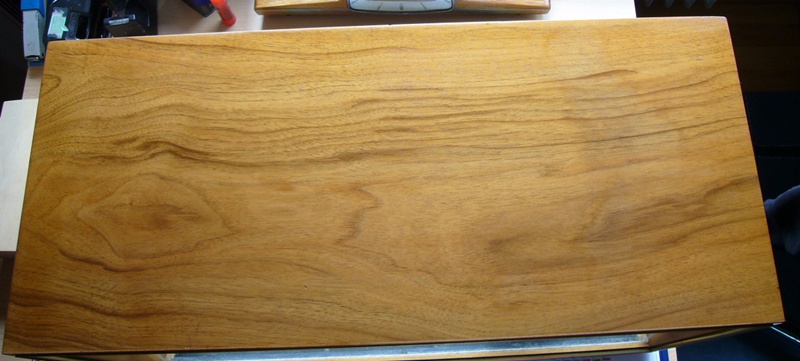 Danach Feinschliff, Bimsmehl und Schellack. Einen kleinen "Tick" helle Beize zum Schellack dazugegeben, wegen der ges. Farbe. Denn wenn der Deckel abgeschliffen wird, gibt es fast immer ein anderes "Gesamtergebnis".