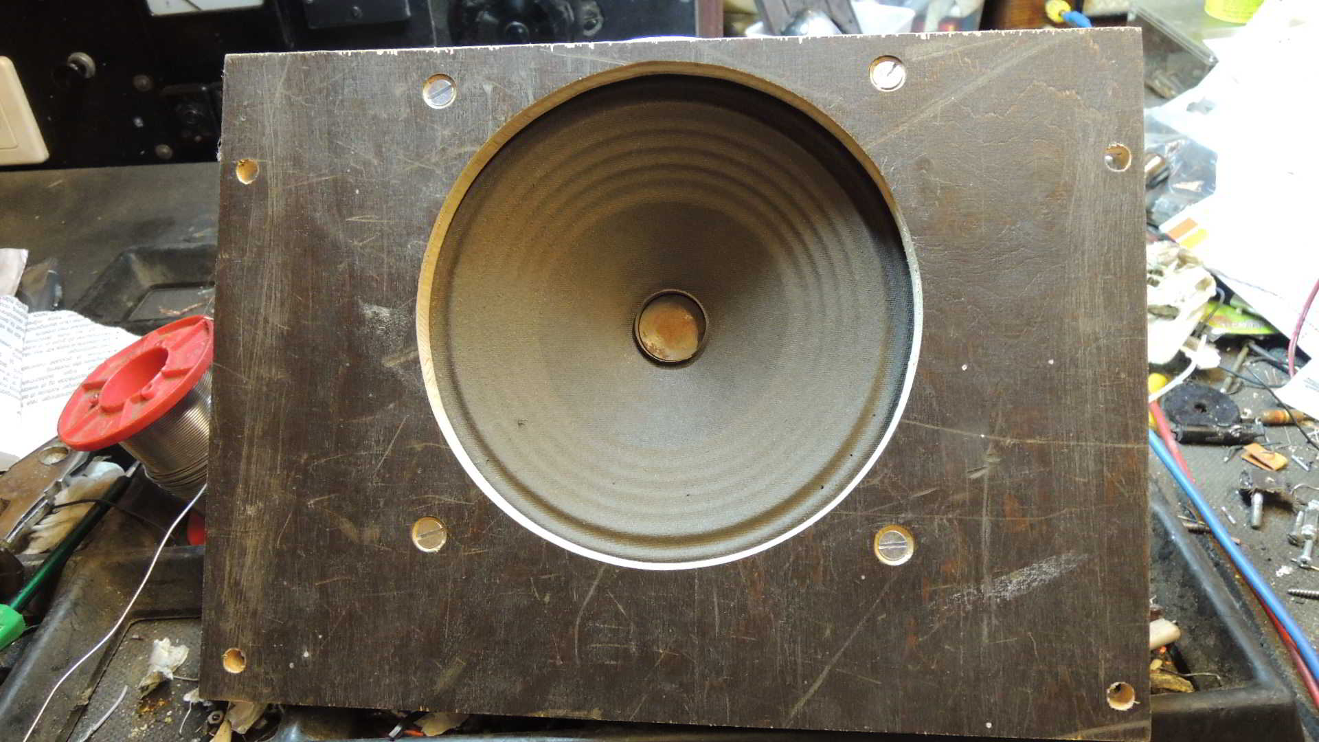 Der Lautsprecher entstammt übrigens einer Lumophon-Ruine. Er wurde nur von außen etwas mit Felgensilber eingesprüht. Alle Teile, die keine Farbe abbekommen sollten wurden natürlich abgedeckt. Wie findet Ihr die Schallwand? Ich meine, die sieht aus wie original. Ich habe viel Holzbretter aus den 20 er und 30 er Jahren. Nun wird die Lautsprecheröffnung ja mit der Stichsäge sehr ungerade. Hier kam zum ersten Mal meine Oberfräse zum Einsatz. Es wurde auf das gewünschte Brett eine Schallwand gelegt, die ein etwas größeres Loch hatte. Dann konnte ich mit der Oberfräse das Loch machen. Sieht doch gut aus - oder. Jetzt gibt es wieder ein paar Bilder, ich setze das heute fort! Übrigens mußte ich nochmal die Schallwand entfernen, weil sich der Lautsprecherstoff etwas gelockert hat. Die Strafe, wenn man schlecht klebt und zu voreilig ist. Man sieht das am letzten Bild. Das wollte sich so nicht lassen.