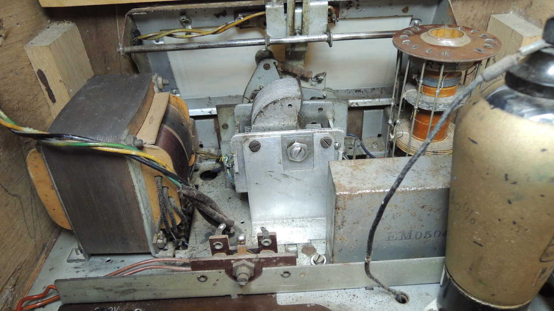 . Der Netztrafo sah sehr mitgenommen aus, war auch ersetzt, aber mechanisch passend. Der Originale hatte eine Heizwindung für die Gleichrichterröhre, 1 X 1284 und1X 964. Der neue hatte einen Heizkreis für die Gleichrichterröhre und 1 für die beiden Röhren. Das zum Chassis. Das Gehäuse war fast schon zum Wegwerfen. Loses Furnier an allen Seiten. Der Holzrahmen links von irgendeinem Tier durchgefressen. Vom Mende-Zeichen fehlte der linke Schenkel, der war abgebrochen. Keine Rückwand. Da ich das Gerät erst nicht retten wollte, habe ich keine Fotos gemacht. Es kam alles spontan. Fangen wir mal beim Chassis weiter an. Das Erste war ja nun gemacht. Das Gerät hat vorne einen Wellenschalter zum Antenne anpassen 2 x Mittel und 2 x Langwelle. Diese Anschlüsse gehen an die VE-Spule. Die weiteren erforderlichen maßnahmen wurden oben beschrieben. Nachdem eine Antenne angeschlossen wurde spielte das Radio, plötzlich trennte es gar nicht mehr. Es war ein Wackelkontakt. Spielen, wieder keine Trennung. Es konnte nur der Drehko sein. Nach Ausbau die Erleuchtung. Die Lötung am Plattenpaket war gebrochen und hatte dadurch immer wieder Ausfall. Es konnte nicht verstimmt werden, daher keine Trennung. Also, alle Empfangsprobleme waren gelöst. Fast. Im Anodenkreis der RENS1284 ist eine sog. Hochfrequenzdrossel. Die haben immer so um die 20 Kiloohm. Woher nehmen. Ein Kollege aus dem Nachbarforum auch hier (Wumpus) machte sich Gedanken. Etwas, was man sich merken sollte, ich wußte das auch nicht. Es gibt kleine Netztrafos so um primär 5 Volt mit ganz wenig mA. Sowas... der Trafo hat primärseitig tatsächlich 14 k-Ohm! Den nahm ich. Das funktioniert perfekt.
