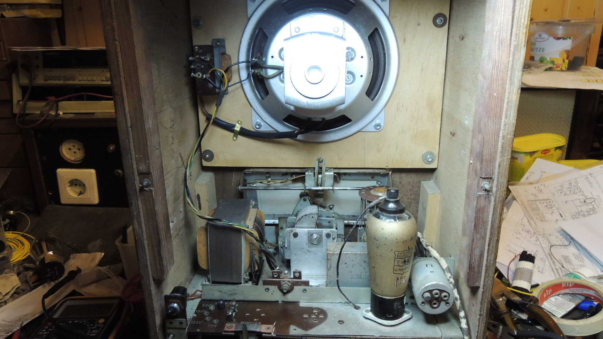 Das Gehäuse, auch Selbstbau gewinnt keinen Schöhnheitspreis, aber daraus kann man was machen. Das Gehäsue ist vollgestopft das es der Sau graust, auch sind hier alle möglichen Röhren verbaut, Rimlock..........