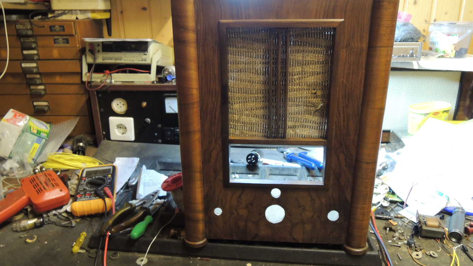 vielen Dank für Deine Anerkennung! Hat mich sehr gefreut. Nun habt Ihr ja alle das Gehäuse vorher nicht gesehen. Es war ein verwahrloster Holzkasten, bei dem erstmal der Rahmen entfernt werden mußte, weil der an der einen Seite durch irgendein Tier völlig durchgenagt war. Als das geklappt hatte (Fast, der Rahmen brach an der Knabberstelle), mußte erstmal das wellige Furnier geleimt werden. Das war aber wundersamerweise alles noch dran. Also Holzleim mit dem Spachtel drunter geschoben. Zwingen an das Gehäuse und pressen, was das Zeug hält. Das hat geklappt. Nun war der Kasten auch nicht mehr so empfindlich. Wenn unvorsichtiger Weise Furnier abbricht und verschwindet ist das ärgerlich. Nun zum Rahmen. Der mußte auch erstmal wieder stabiler werden. Ich habe das angefressene im Rahmen droßzügig rausgesägt und ein neues Stück Holz eingeleimt und die Form mit Schleifpapier (sehr grobes) der Form angepaßt. Danach wurde der Rahmen komplett mit feinerem Schleifpapier geschliffen. Der Holzersatz fiel nun kaum noch auf. Die Maserung paßt einigermaßen. Was noch fehlte war die linke Mendestrebe. Ich holte mir hier nach Muster eine Holzleiste vom Baumarkt. leimte oben einen kleinen Holzklotz an. Die Leiste mußte so schmal, wie das restliche M (für Mende)gemacht werden. Der Holzklotz wurde dann in Anlehnung an den anderen Bogen vorsichtig mit dem Dremel grob gestaltet. Danach war wieder Schleifpapier angesagt. Nach Einleimen sieht man kaum einen Unterschied. Trotz Abschleifen des Rahmens war das alte Holz dunkler, als das nachgearbeitete. Ich habe hier mehrmals dunkel gebeizt und immer wieder angeschliffen. Nachdem ich den Rahmen gebeizt hatte, fiel das Neuholz kaum noch auf. Nun habe ich Holzgehäuse und Rahmen getrennt mit Schellack lackiert. Alles glänzt wieder sehr schön. Übrigens Teile, wie das Mende-Zeichen, an das man innen nicht so dran kommt kann man durchaus auch etwas mit Schellack einpinseln. Aber sehr dünn! Dafür immer wieder.