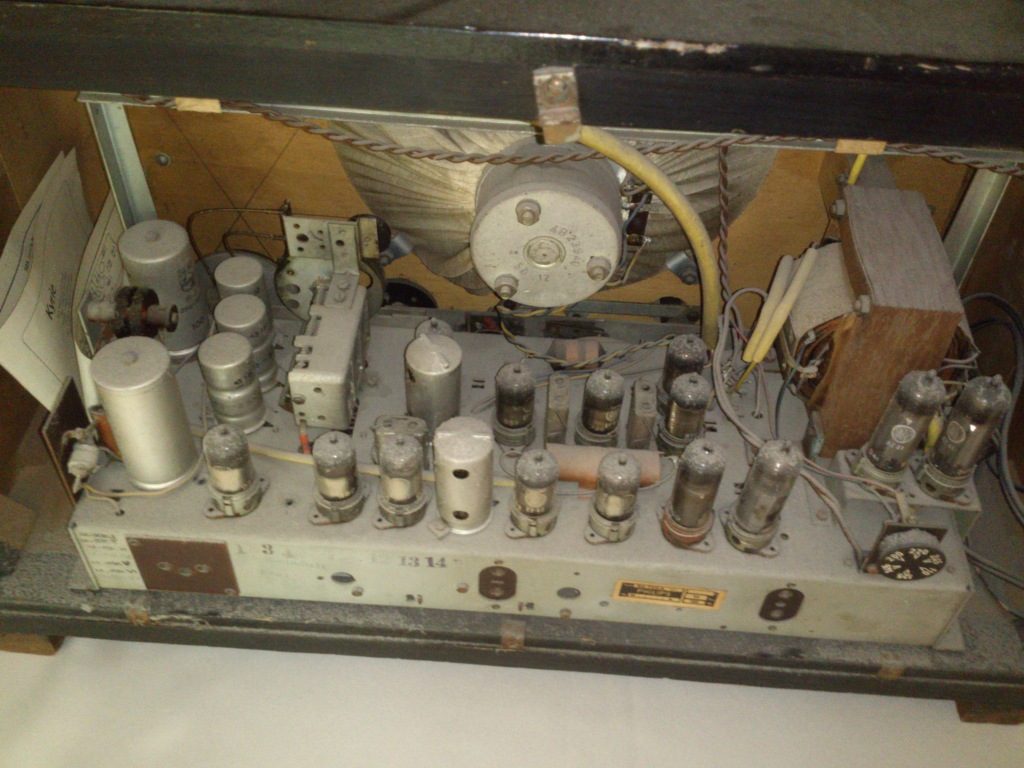 Ich überlege wie die UKW-Qualität so ist und ob es Sinn macht dieses Röhrenmonster(15 Röhren) in einen betriebsfähigen Zustand zu versetzen. Immerhin werkeln da zwei EL41 als Endröhren und befeuern einen riesigen Lautsprecher. Das Ganze wird versorgt über zwei AZ41 - eine reichte wohl nicht.
