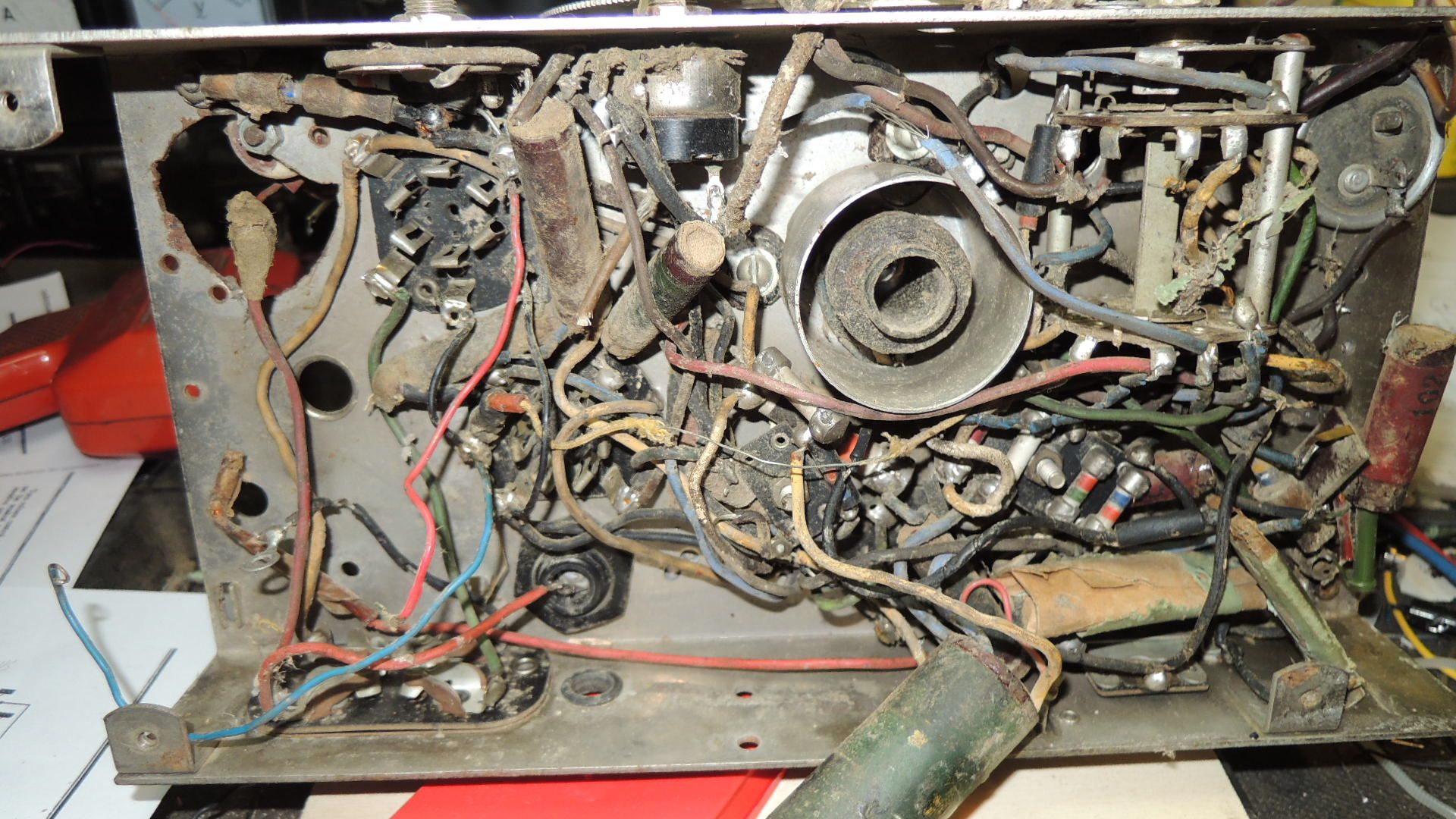 mal wieder zum Atwater 145. Gestern nun habe ich mal damit angefangen, die sicherlich schlechten Kondensatoren zu tauschen. Die teilweise porösen Kabel hatte ich erstmal provisorisch isoliert, damit es hier nicht funkt. Die Skalenbleuchtung wurde erstmal abgelötet. Wie gesagt, alles was "Ballast" ist wird erstmal fern gehalten. Nun habe ich dann den Trafo angeschlossen. Sekundär nutzt er momentan eine Halbwelle des Anodenwickels. Dann geht es auf den Anschluß der Lautsprecherbuchse. Ebenso wurden die Heizungsanschlüsse für die 2,5 Volt Röhren angeschlossen. Nochmals genaue Sichtkontrolle. Jetzt habe ich vorsichtig Spannung auf den Trafo gelegt und hochgeregelt. Plötzlich begann Leben in das Gerät zu kommen. Der Netzton war hörbar. Tippt man auf das Steuergitter der Triode-Anode gibt es ein lautes Kreischen. Womit ich nicht gerechnet hätte: Wenn man mit dem Finger auf die davor befindliche 1 SZ-Röhre tippt, wackelt bei niedriger Lautstärke das Lautsprechertuch vom Prüflautsprecher. Es sieht also ganz hoffnungsvoll mit dem Radio aus. Brummeinstreuungen des Netztrafos gibt es keine, auch die entsprechenden Spannungen sind richtig. Wie geht es weiter? Heute werde ich die im Moment noch freie 5 Volt-Gleichrichterheizung auf die ECH42 geben. Mal sehen, ob der Oszillator sich noch rührt. Die ECH 42 war übrigens in der Tat mit über die 2,5 Volt Heizung der anderen Röhren geheizt worden. Wenn der Oszillator nicht funktionieren sollte versuche ich zunächst eine andere ECH42. Vielleicht ist die andere schon längst an Unterheizung defekt geworden. Ich schrieb ja bereits, sollte sich die Eingangsstufe mit Oszillator auch als reparabel erweisen, werde ich sofort die passende Mischröhre und die Gleichrichterröhre 80 beschaffen.