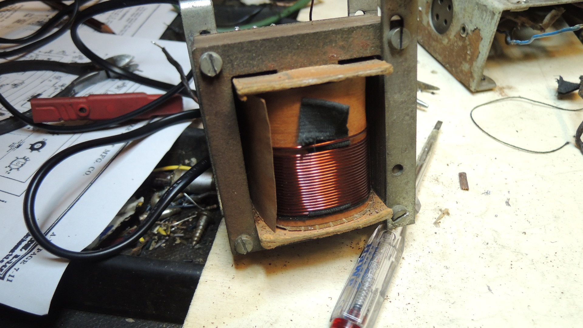 nun habe ich also den Netztrafo für meinen Adwater 145 umgemodelt. D. H. Nochmal zum Wiederholen: Wir benötigen eine Heizspannung von 5 Volt für die Gleichrichterröhre und 2,5 Volt für die übrigen Röhren. Es müssen also die vorhandenen Wicklungen geändert werden. Oben auf dem Trafo befindet sich die Heizwicklung (4 Volt) für die ehem. AZ11. Darunter die übliche Heizspannung für die ehem. Stahlröhren. Ich habe nun als Erstes die Heizwicklungen für die AZ11 abgewickelt. Nachdem das geschafft war, habe ich die darunterliegenden Heizwindungen auf 2,8 Volt reduziert. Isolierpapier drüber und nun kam die große Fummelei. Die 5 Volt Heizung für die neue Gleichrichterröhre muß her. Also habe ich die vorhandenen Windungen auf den Trafokörper gewickelt und habe etwas Kupferdraht zusätzlich aufgewickelt, so dass ich auf die Heizspannung von 5,2 Volt kam. Da ich, verständlicherweise erst mal sehen will, ob das Radio dann später auch wieder spielt, werde ich noch keine neue Röhre 80 einbauen. Ich nutze von der Hochspannungswicklung die halbe Windungszahl (also 1 Anode bis Mittenanschluß) und nehme einen kleinen Brückengleichrichter. Ich denke, diese Anodenspannung sollte erstmal reichen. Den Trafo werde ich erstmal an zwei vorhandenen Löchern festschrauben. Ich muß prüfen, ob er so stehen kann, oder ob wir Netzeinstrahlung (Brummen) haben. Dann muß ich ihn vielleicht noch drehen. Es kann aber auch sein, dass ich mir, falls das Radio mich zufrieden stellt, von einem Bekannten einen 110 Volt-Netztrafo konstruieren lasse mit den passenden Spannungswerten. Aber das zeigt sich. Dann wurden nachträglich auf das Chassis Netzelkos mit 50 µf gebaut. Das wird wohl die 80 umgehauen haben. Die Dinger ersetze ich durch Becherelkos von 16 µf.