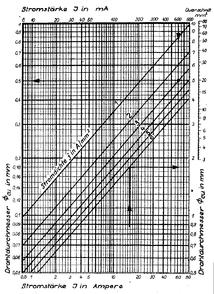 Interessantes Projekt! Ich hatte das Teil auch in der Überlegung. Genau genommen müsste der Drahtquerschnitt für die 2,5 V stärker sein, weil der Strom auch bei der niedrigen Spannung höher ist. Auch die max. Leistung des Trafos (Größe, Bauform) muss beachtet werden. Gerade die Heizleistung war bei den alten Röhren größer als bei den neuern Serie. Die Verringerung der Heizleistung war immer ein Ziel der Röhrenentwicklung, der Ersatztrafo stammt aus der 50ern während das Radio aus den 30ern stammt. Eine Berechnung der VA des Originalen Trafos müsste mit der Größe des Ersatztrafos (wahrscheinlich Dyn. Bl. IV) übereinstimmen. Noch ein kleines Nomogramm von ca. 1950 für die Drahtdurchmesser.