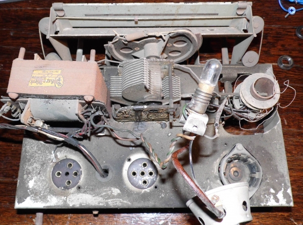 Als ich den Trafo und den Drehko gereinigt hatte, machte ich mich an das Chassis ran und Säuberte es. Das ist in den Folgenden Bildern zu sehen. So sah es aus, als der Trafo und der Drehko abmontiert waren.