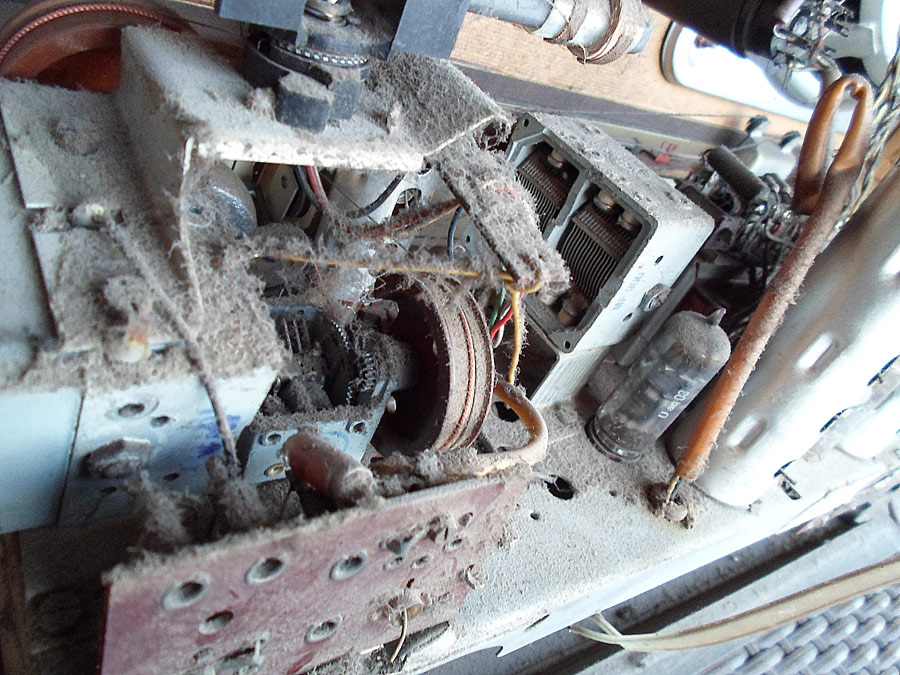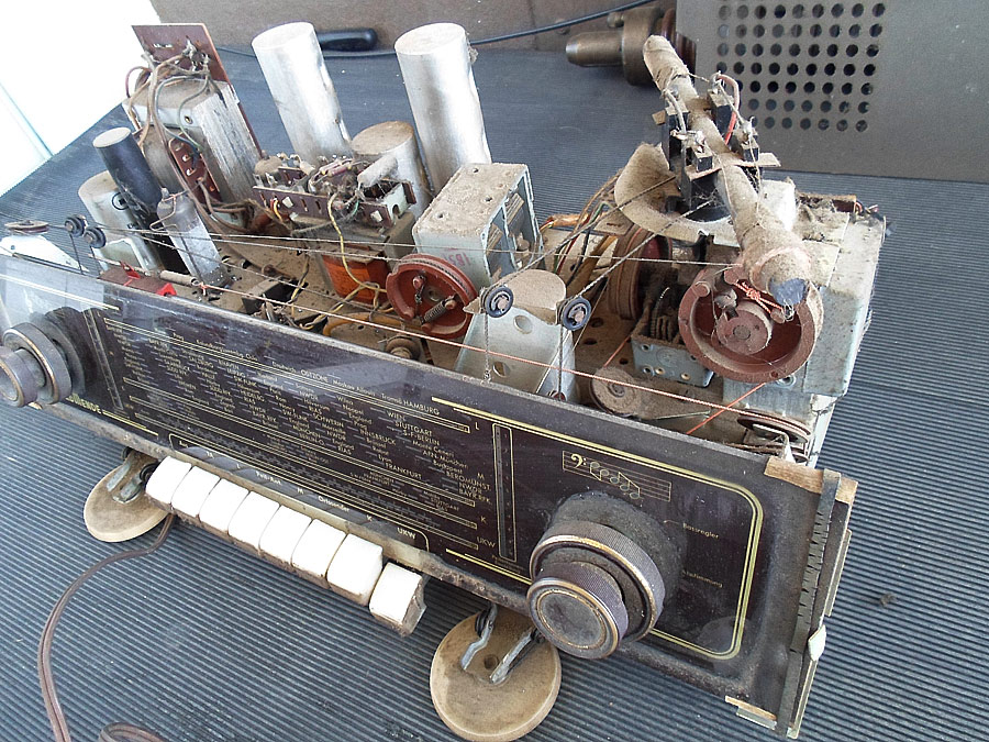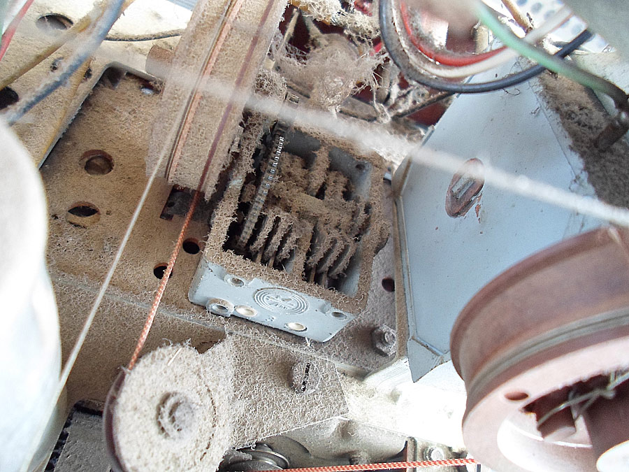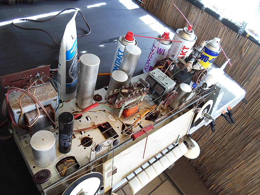 Nach dem, das Chassis trocken wird, kommt erste wichtige Arbeit. Die ganze Mechanik muss sauber gemacht werden. Ich mache das mit verschiedenen Mittels. Wichtig - gut alte Schmierung zu entfernen. Dann wird alles neu eingeschmiert, aber nicht zu viel, und eingestellt. Meistens sind die Drehkos betroffen, die gehen gar nicht mehr, oder sehr schwer. Zweite Stelle ist die UKW Umschaltmechanik, meistens klemmt. Nach dem bringe ich alle Kontakten bei dem Tastenschalter mit "Kontakt-60", 61 und WL in Ordnung. Genau so auch die Potis werden behandelt.