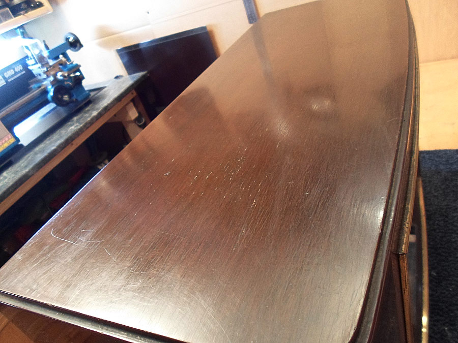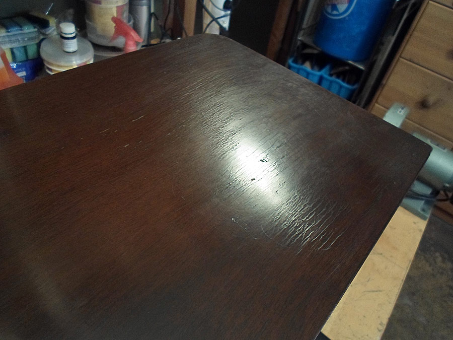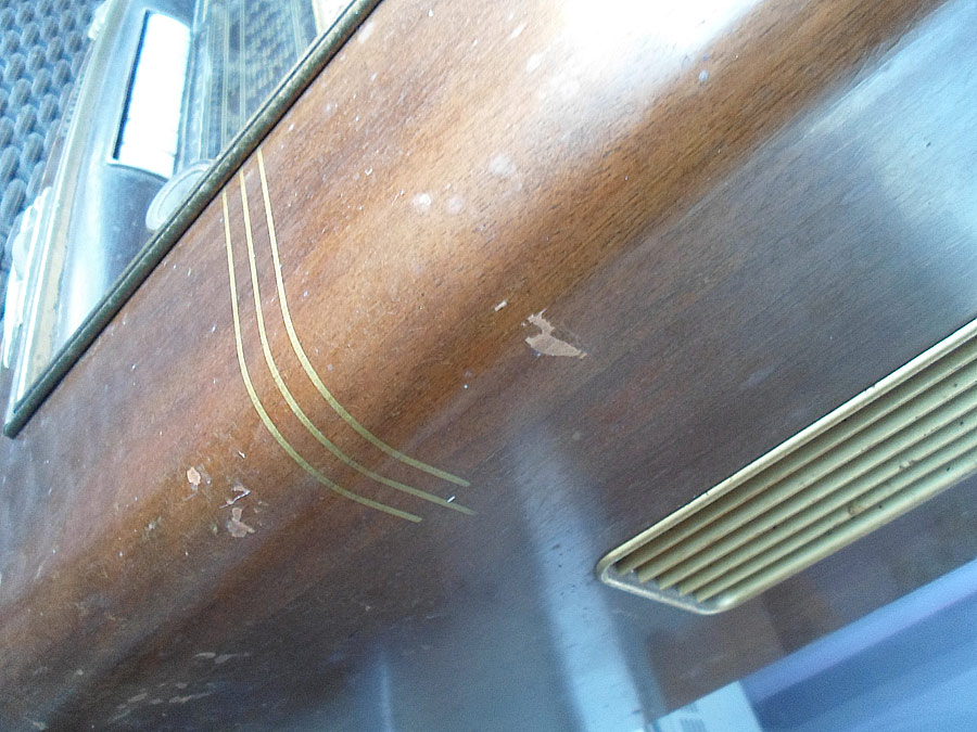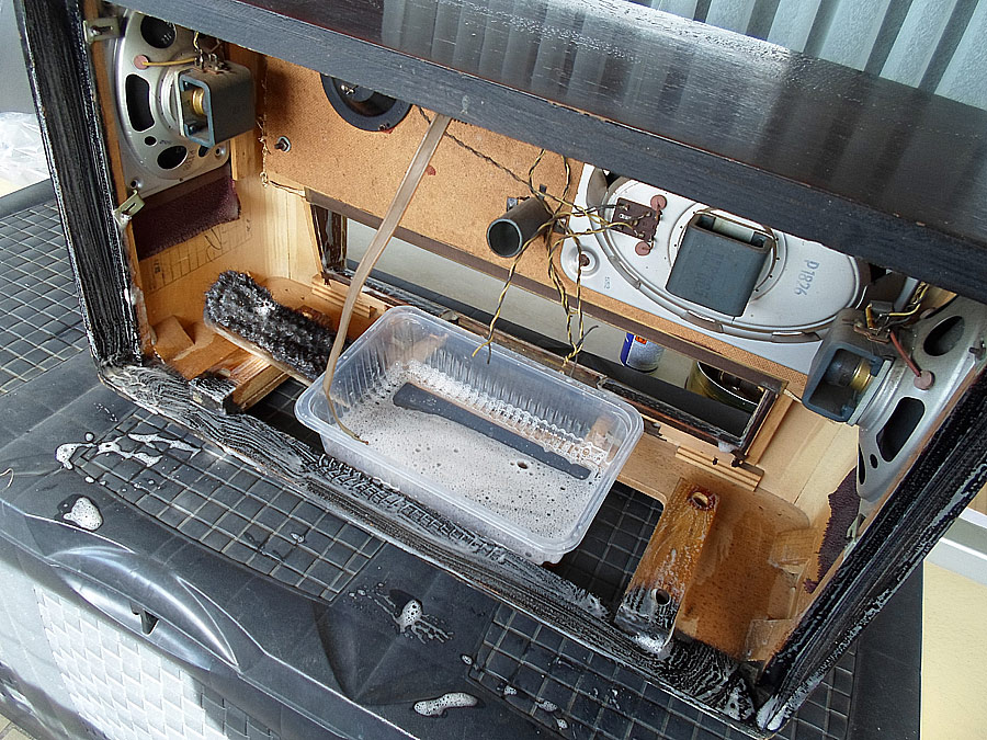 Ich probiere das Lackschicht vom Gehäuse zu reparieren. Da für gibt mehrere Wege. Z.B. mit so genannten Französische Politur. Gute Ergebnis bringt auch Arbeit mit dem Lackreinigung, aber hier geht es nicht. Das Gehäuse ist zu stark beschädigt. Mann muss erst mal die Furnier reparieren, was schon nicht einfach ist, und dann abgeblätterte Lackstelle möglich gut vertonen, das die nicht, oder fast nicht zu sehen werden. Ist auch nicht leichte Aufgabe. Dazu kommt noch Probleme mit fehlende Leiste. Die soll ich auch irgend wie selbst basteln. Also, irgend wie versuche ich das alles hinzukriegen.