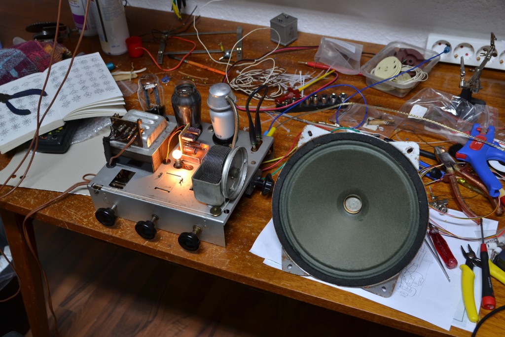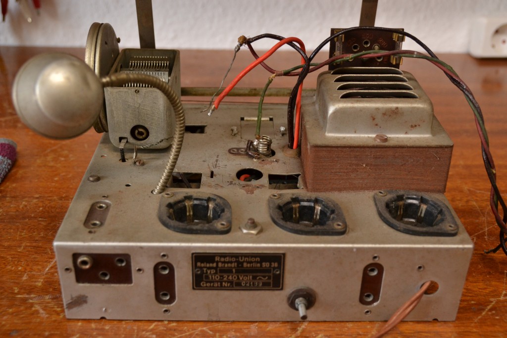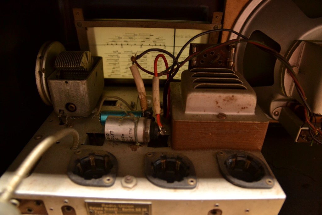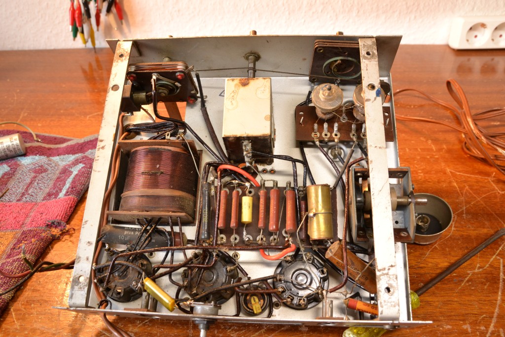 Anschließend wurde der Gerät komplett zerlegt, Kleinteile per Ultraschall gereinigt, empfindliche Komponenten wurden per Hand vom Dreck der Jahrzehnte befreit. Das Chassis selbst kam, mitsamt Röhrensocken, ein paar Drähten und Widerständen, in die Spülmaschine. Was zunächst etwas wüst klingt, funktioniert jedoch ganz hervorragend! Wichtig ist nur eine ausgiebige Nachbehandlung mit dem Föhn, um die Feuchtigkeit auch zeitnah wieder aus dem Gerät herauszubekommen.