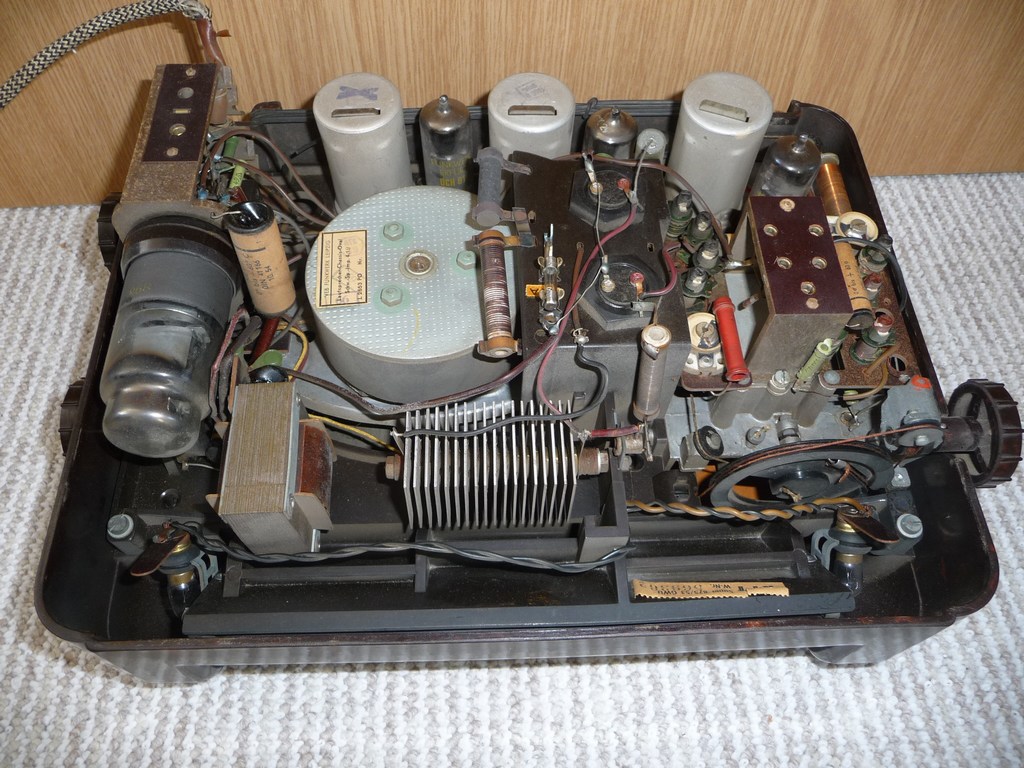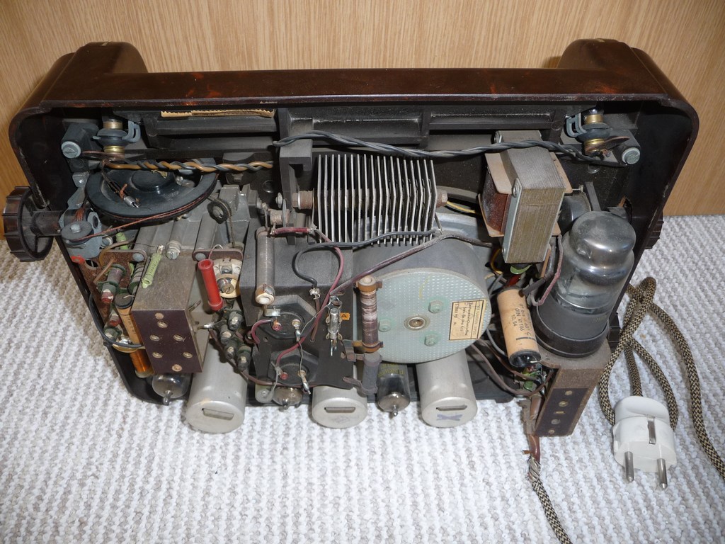 Innen sieht er recht sauber und unverbastelt aus, ich konnte nur ein getauschtes Teil finden. Sogar ein zusammengefalteter Schaltplan steckte drin. Die Röhrenbestückung ist 2x UCH 81, UF 85 und UEL 51. Schöne Mischung, er gefällt mir immer besser...