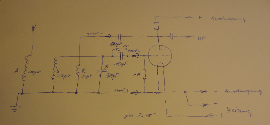 Ja, daher nun auch die drei Leitungen zur Audionröhre. 1x Anode, 1x Kathode (Masse), 1x Gitter. Für Deinen Audionschwingkreis brauchst Du drei Steckspulen. Über die beiden Schwenker außen wird die Kopllung auf die eigentliche Schwingkreisspule in der Mitte eingestellt. Diese Spulen kannst Du sogar noch kaufen oder selbst aus abgeschmirgelten CD- Rohlingen herstellen. Du brauchst in etwa 2x 250uH (Antennen- und Schwingkreis) und etwa 30uH für die Rückkopplungsspule.