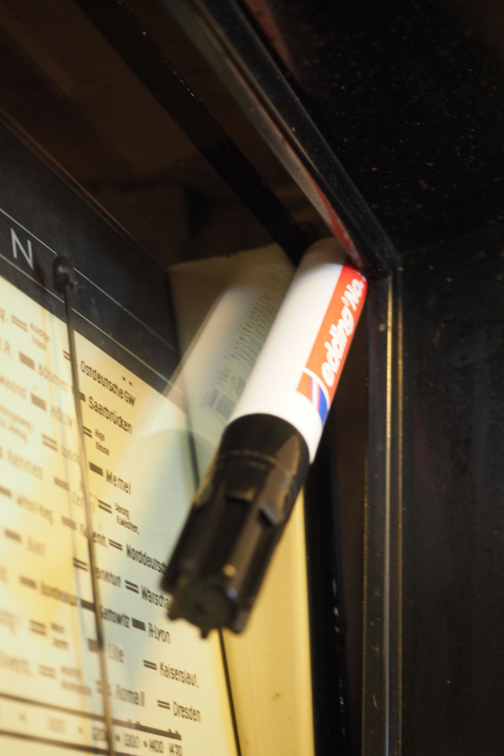 Schondorfer:Martin, guten Abend, danke und ich hoffe ich störe nicht beim Tatort :-) Seitenteilchen...ja, die sind aus Blech, fest an der Skala und mit der gleichen Farbe gespritzt - die meinst Du - oder? Die sorgen für den Abstand von der Blechskala zum Glas...unten näher als oben, also Glas steht steiler als Skala, die beiden sind nicht parallel. Soweit, so gut. Nun geht es um den Abstand vom Glas zum Gehäuse(rahmen). Im Holzgehäuse ist ein großer Rahmen (schwarzes Bakelit??) für Lautsprecher und Anzeige. Der Lautsprecherstoff/Schallwand liegt mit allen 4 Seiten bündig am Rahmen - kein "Luftspalt", klaro. Bei mir, das Glas: es steht steiler als die Blechskala (eben durch den Verlauf der Seitenteile an der Skala). Aber der Rahmen steht noch steiler. d. h. das Glas liegt unten am Bakelit an...und oben steht steht der Rahmen fast 1 cm vom Glas ab. D. h. es ist oben Luft zwischen Gehäuse(rahmen) und Glas. Das soll doch nicht sein? Soll nicht das Glas ringsum am Bakelitrahmen anliegen? Wahrscheinlich hab ich zu zeitig gepostet, alles ist zerlegt, sorry. Morgen bau ich alles zusammen und bringe Fotos.