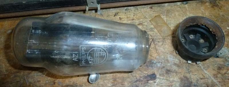 Das Gehäuse braucht auf jeden Fall Streicheleinheiten, der Lack blättert überall ab, sofern es noch dran hat. Aber gröbere Schäden hat es keine. Die Elektronik wird wohl die üblichen Problemchen mit Papierkondensatoren und schlechten Kontakten haben. Für die AZ1 brauche ich auf jeden Fall Ersatz, auf die Schnelle kann ich auch eine Ersatzlösung in den Sockel der defekten Röhre bauen.