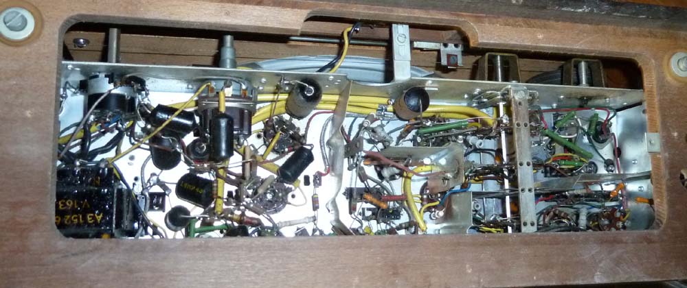 Elektrisch hat es auch ein paar Besonderheiten. Für AM ist es noch 'normal': ECH42, dann ein zweistufiger ZF-Verstärker mit EF43 und EAF42, wobei die Diode der EAF42 als AM-Demodulator verwendet wird. Für UKW gibt es eine HF-Stufe mit der EF42, danach wird ebenfalls die ECH42 als Mischer und Oszillator verwendet, was ziemlich abenteuerlich ist, da einerseits diese Röhre nicht für so hohe Frequenzen gedacht ist und andererseits durch die notwendigen Umschalter die Leitungen für UKW unnötig verlängert werden, was sehr schädlich ist. Danach folgt derselbe ZF-Verstärker wie für AM, einfach mit den 10.7MHz-Filtern. Als Demodulator dient ein Ratiodetektor mit einer EB91. Der NF-Pfad hat es auch in sich. Als NF-Vorstufe dient die EBC41, wobei die beiden Dioden keine Funktion haben. Als Endstufe dient die EL41. Die Kathodenwiderstände sind nicht mit Elkos überbrückt. Um den Verstärkungsverlust durch die Gegenkopplung zu kompensieren, gibt es eine Rückkopplung von der Kathode der Endstufe zur Kathode der Vorstufe, eine interessante Variante, und erspart die Prüfung eines verdächtigen Kondensators. Weiter gibt es von der Sekundärwicklung des Ausgangstrafos zur Vorstufe eine Gegenkopplung, in der auch eine Klangregelung eingebaut ist. Dabei können die Höhen mit einem Poti abgeschwächt werden, während für den Bass ein Schalter vorhanden ist. Die Heizung der EBC41 ist ebenfalls speziell: Damit vom Heizfaden kein Brummstrom eingespeist werden kann, wird diese Röhre über eine separate Wicklung geheizt, die über einen Spannungsteiler gegenüber der Kathode positiv vorgespannt ist. So wird bei einer allfälligen Elektronen-Emission des Heizfadens (parasitäre Diode) ein Stromfluss zur Kathode verhindert.