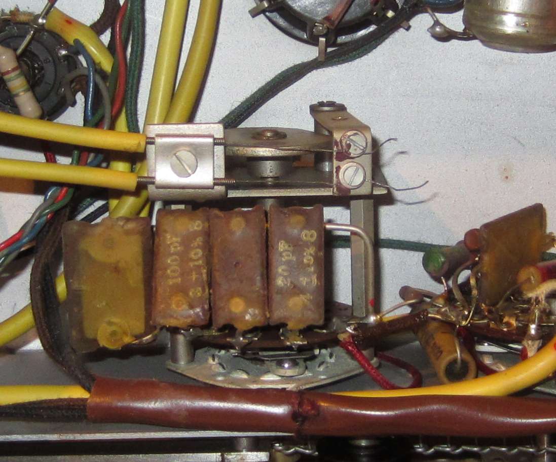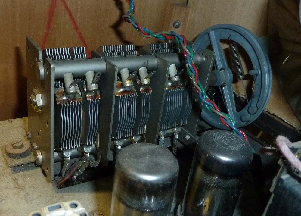 Er besteht aus drei grossen und drei kleinen Kondensatoren. Für LW und MW wird jeweils ein grosser und ein kleiner parallelgeschaltet, für KW2 wird nur der grosse und für KW1 nur der kleine verwendet. Dadurch wird die Schwingkreisgüte optimal, dafür braucht es ebenfalls zusätzliche Umschaltkontakte.