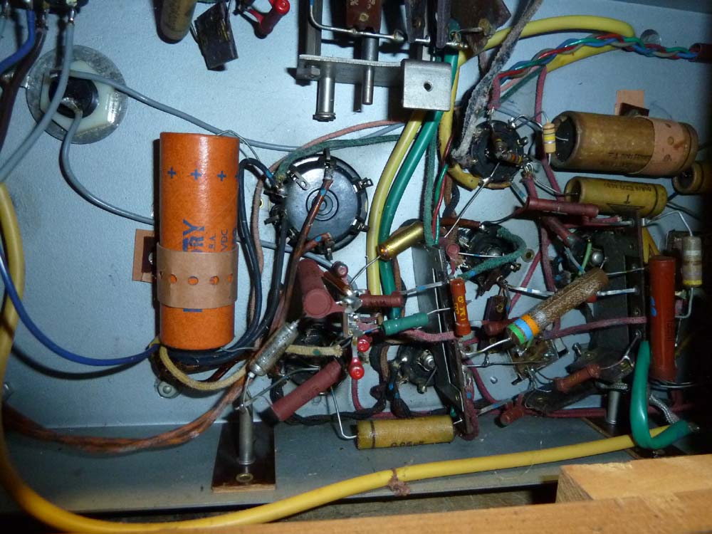 Das Lautstärkepoti mit dem Netzschalter wurde auch ersetzt, es passt optisch nicht in die Zeit und die Anzapfung der Widerstandsbahn für die gehörrichtige Lautstärkeregelung fehlt. Damit kann man leben. Das Netzkabel dürfte auch ersetzt worden sein, PVC-Kabel ohne Mantel kamen erst später auf. Weiter wurde netzseitig noch eine Sicherung eingebaut, was sicher keine schlechte Idee ist.
