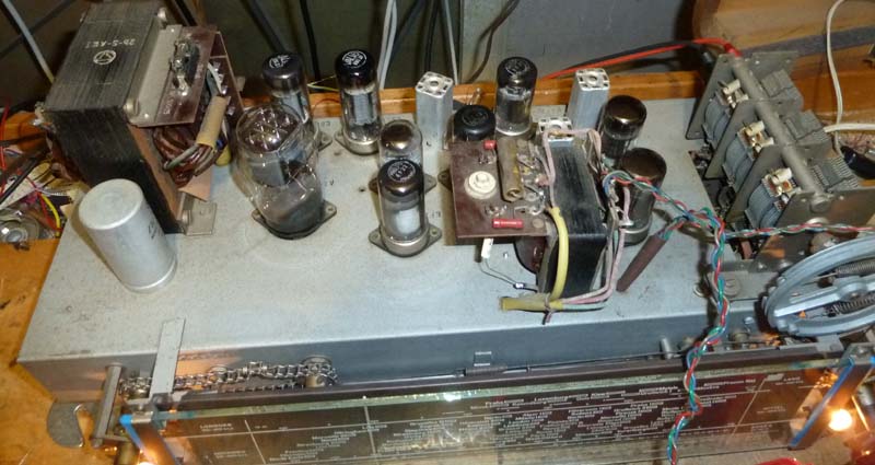 Bei diesen Reparaturen sind mir noch weitere Schaltungsdetails aufgefallen. Für die beiden Kurzwellenbänder wird die Schirmgitterspannung der beiden ZF-Stufen und des Mischers erhöht, was für Kurzwelle eine höhere Verstärkung ergibt. Beim hochfrequenten Kurzwellenband (K1) wird zusätzlich noch der Kathdenwiderstand der HF-Vorstufe überbrückt, was nochmals etwas Verstärkung und auch zusätzliche Empfindlichkeit bringt. Im NF-Pfad gibt es bei Radioempfang noch eine geringe Anhebung der Frequenzen im Bereich ab ca. 4kHz, damit der Klang etwas heller wird. Bei Plattenspielerbetrieb wird diese Korrektur abgeschaltet. Interessant ist noch, dass bei Plattenspielerbetrieb nur das magische Auge und der Oszillator abgeschaltet wird, alle anderen Röhren arbeiten normal weiter.
