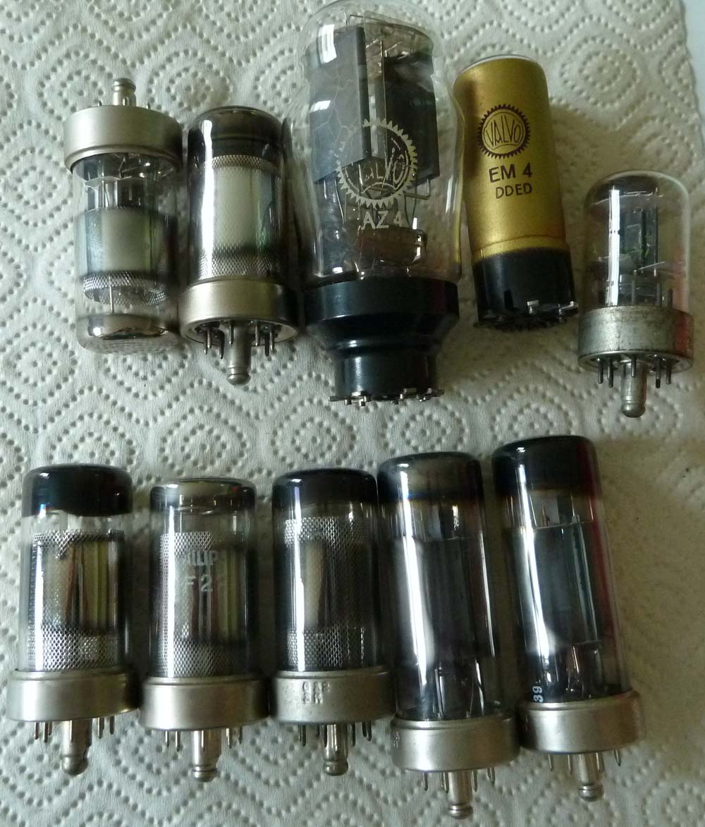 Die Röhren sind gereinigt und glänzen wie neu. Interessant ist, dass sie alle von Philips und Valvo stammen (mit Ausnahme der 6E7, die ist von Sylvania), obwohl Albis mit Siemens zusammenarbeitete und ursprünglich von Telefunken abstammt. Hier das Bild: