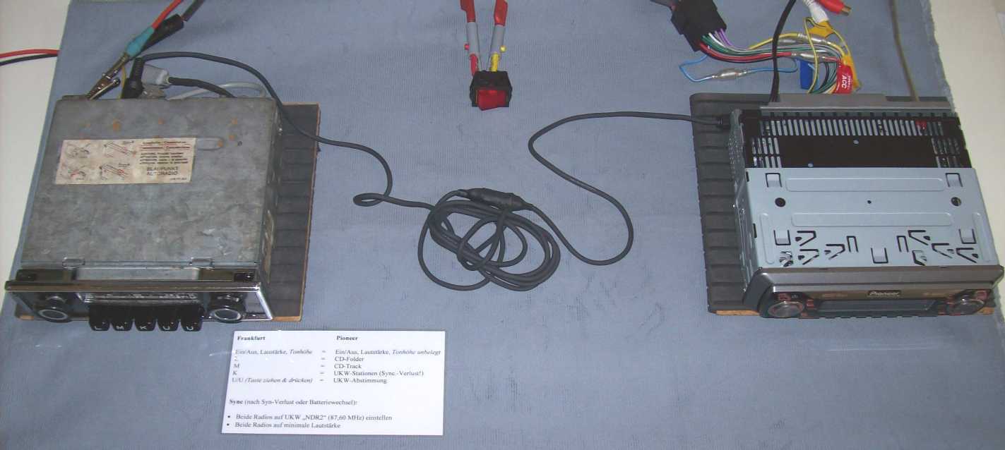 Der rote Schalter in der Mitte emuliert den Zündschlüssel. Und unten liegt die Anleitung. Durch Verdrehen der Mittelwellenfrequenz kann man beispielsweise die CD-Spur im Pioneer auswählen. Auf Langwelle wird der CD-Ordner durchsucht. Auf Kurzwelle wählt man die Radio-Stationen und auf UKW stimmt man Frankfurt und Pioneer frequenzsynchron ab. Lautstärke und ein/aus steuern das Pioneer entsprechend.