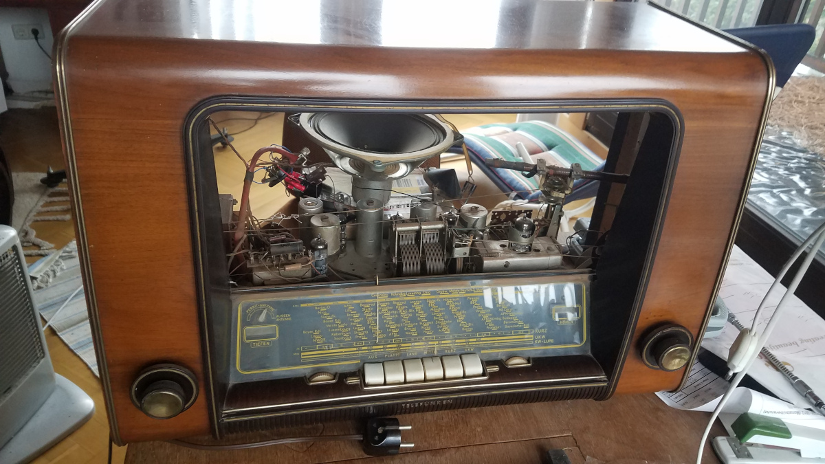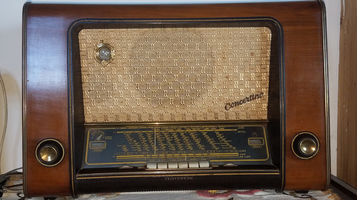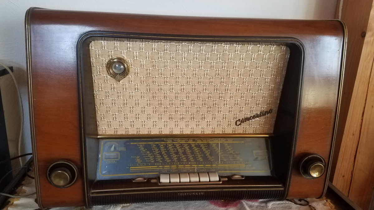Ich habe jezt mal auch ein Foto vom eingeschalteten Zustand hochgeladen. Der Klang von diesem Radio mit den 5 Lautsprechern ist wirklich gut, was auf den Bildern leider nicht so rüber kommt. Nicht zu fassen, dass es schon 70 Jahre alt ist und immer noch funktioniert.