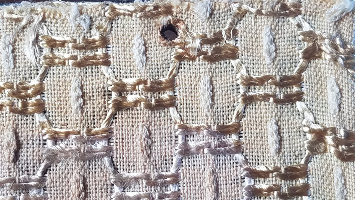 In dem Bereich wo nie das Licht drauffiel, am Rand des Stoffes, kann man gut sehen, wie der Stoff im Neuzustand ausgesehen hat. Das Gold ist im Laufe der Zeit wohl leider verschwunden.