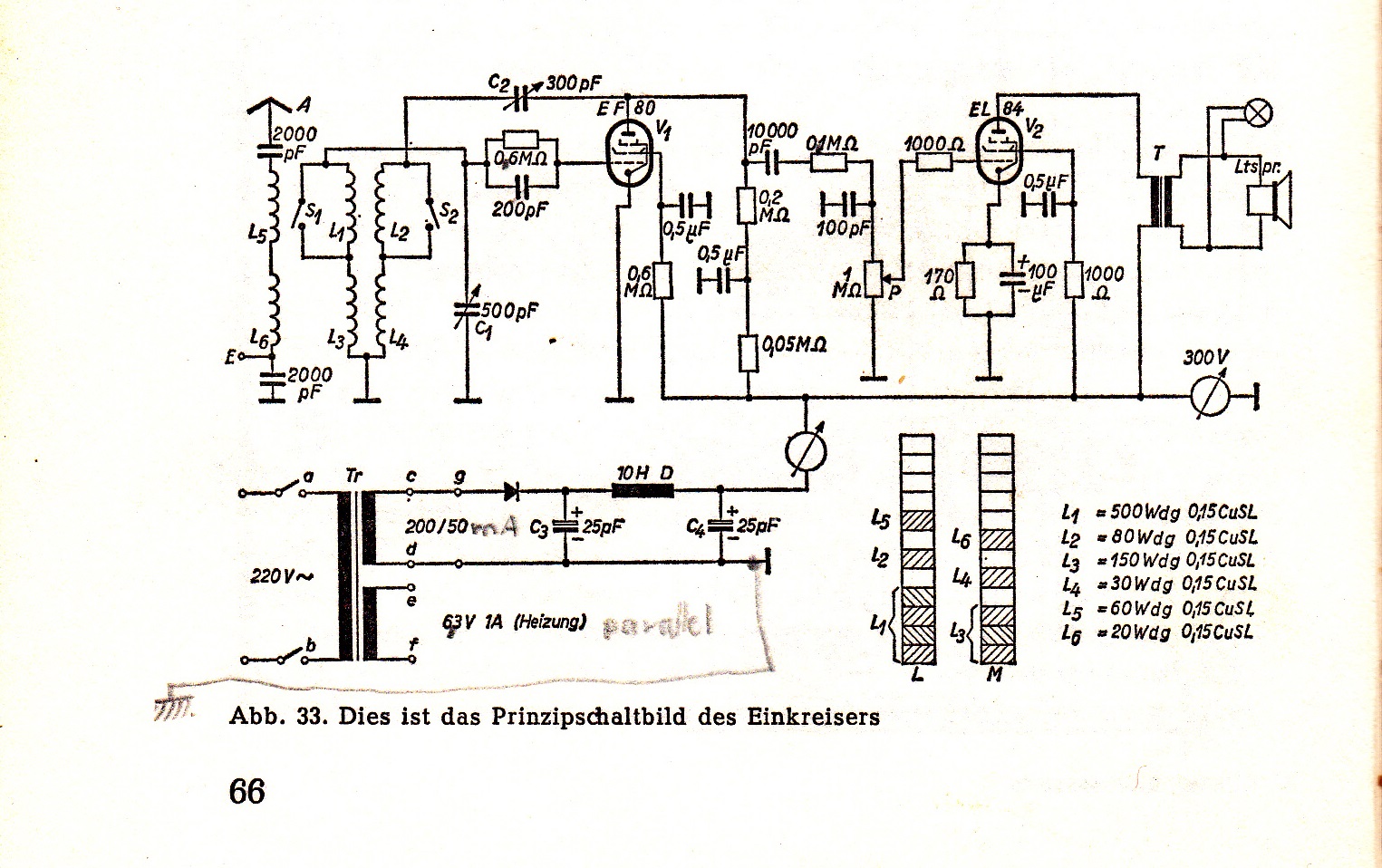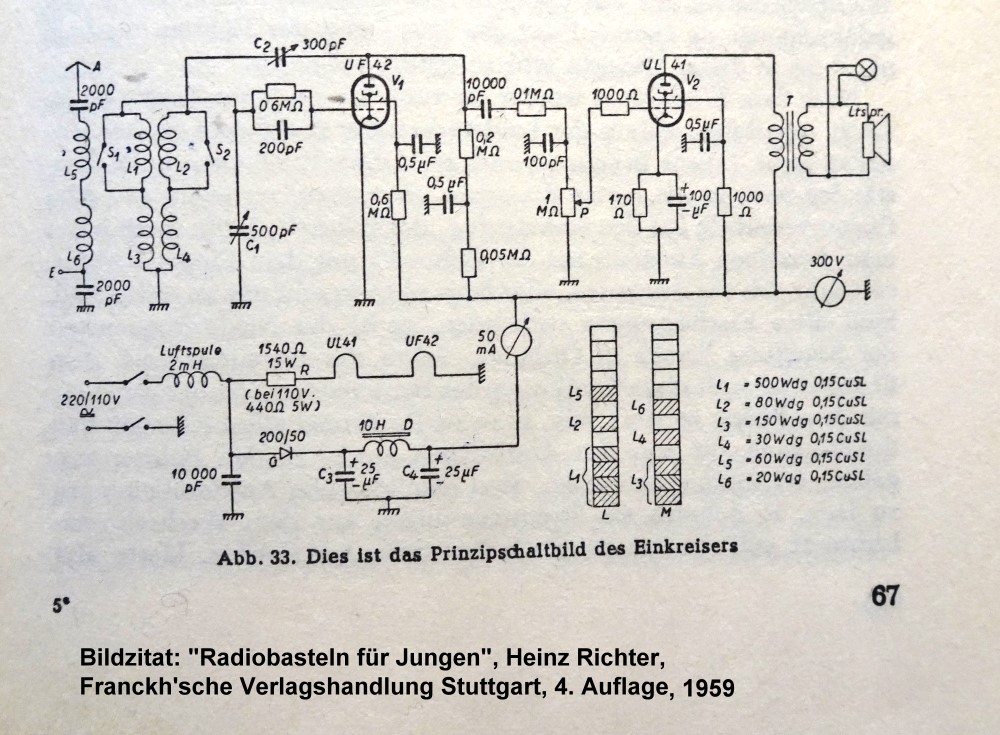 "Radiobasteln für Junge" war auch meine Einstiegslektüre, die fand ich in der Schulbibliothek 1981, allerdings noch eine ältere Version, da war noch die Allstrom-Version der Geradeausempfänger drin mit den Rimlock-Röhren. Der Einkreiser war dann mein erstes Bauprojekt, wobei Improvisieren angesagt war, da die Bauteile eines ausgeschlachteten Grundig-Superhets herhalten mussten. Da gab es zwar eine EL41, aber als HF-Pentode diente dann die EF95, und weil der Grundig einen Netztrafo hatte, war das Ganze als Wechselstromgerät einiges sicherer gebaut. Die Spulen habe ich aus den vorhandenen Kreuzwickelspulen durch Umwickeln neu gemacht, wobei ich wegen der Windungszahl auf Langwelle verzichtet hatte