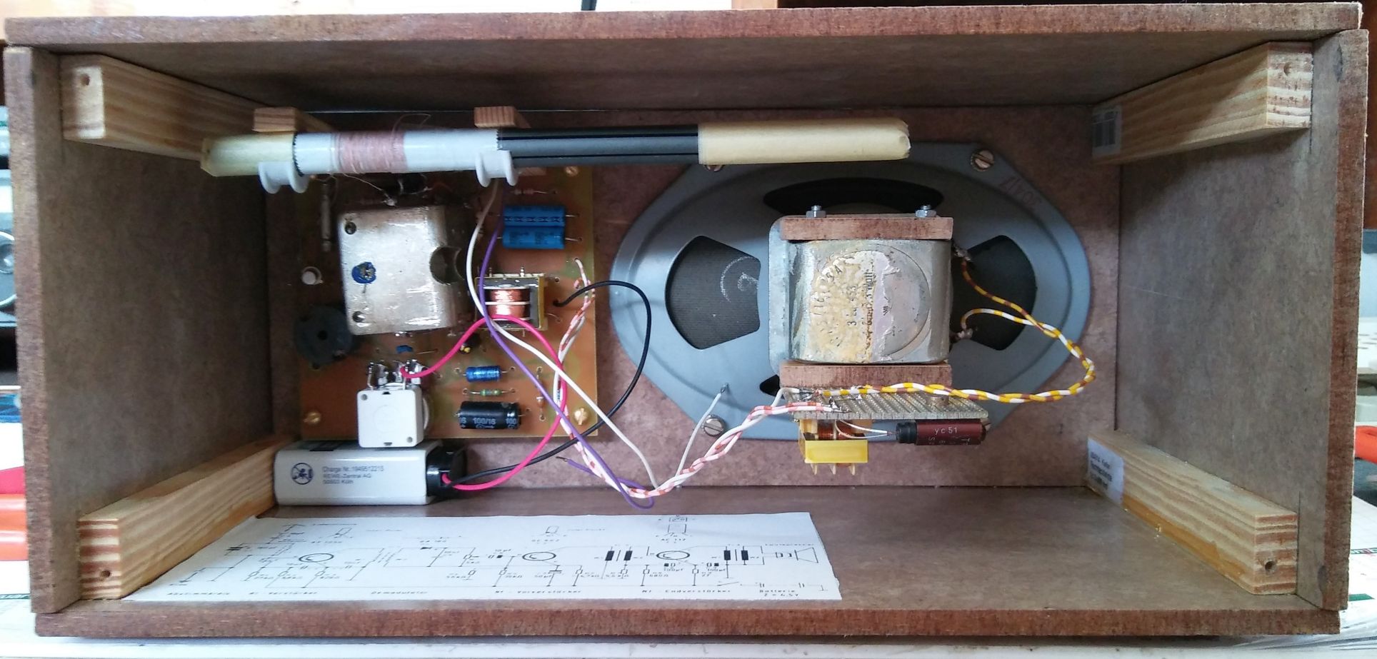 der Nachbau des "Telefunken Kamerad" ist mit sehr befriedigendem Ergebnis beendet. Der Erfolg stand und fiel mit dem HF-Übertrager und den beiden NF-Transformatoren. Am Ende habe ich von einer Wickelaktion der NF-Transformatoren abgesehen. In meinem Bestand befanden sich Miniatur-Trafos 10:1 "ELY9429" auf EI19 Kernen. Für den Zwischentrafo sind sie ok, als Ausgangstrafo aber eigentlich zu klein. Aber auch hier zeigte sich, dass probieren oft über studieren geht. Der AC128K verzerrte etwas und benötigte einen zusätzlichen Basisvorwiderstand von 680 Ohm, der originale AC117 ging schon besser, aber der OC602spez war ein Treffer ganz ohne Verzerrungen, ohne nötigen Basisvorwiderstand und damit ohne Verlust an NF-Amplitude. AC117 und OC602spez sind vergleichbar, aber der OC kann nur einen maximalen Collectorstrom von 0,5A statt 1A vertragen, was hier nicht relevant ist.